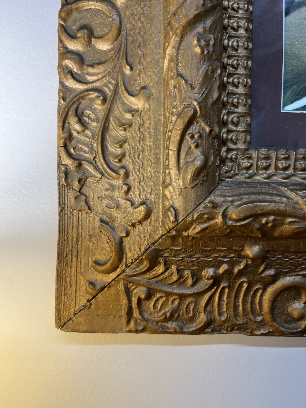 Antique ornate wood frame with original wavy glass, with very old H. B. Dobson print. Frame is in good vintage condition with scrollwork on one corner missing. Print was at some point, cropped to fit frame and has some damage which is not very noticeable unless viewed up close. Brown mat was recently added. This is a beautiful piece of art, especially the frame!