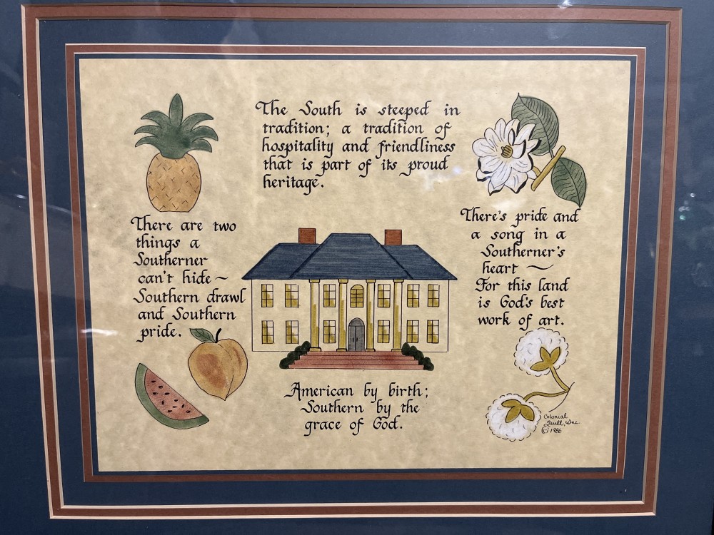 Vintage hand-lettered and drawn Southern artwork by Colonial Quill Inc. in 1986. This beautiful piece of art features a Southern plantation-style house surrounded by fruits and flowers of the South and Southern sentiments, including “American by birth, Southern by the grace of God.” Artwork is professionally framed with multiple mats in a solid wood frame, measuring 18.5“ x 16“ on the outside.