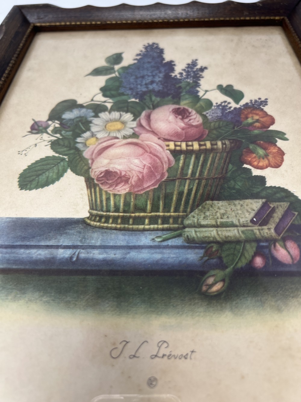 Classic floral still life print by J. L. Provost featuring a basket of garden flowers, framed in warm wood with decorative inner trim. Vtg J. L. Provost Framed Floral Print; approx. 13.5” x 10.5”; wood frame with original wire hanger; minor discoloration to print and light frame scratches consistent with age.