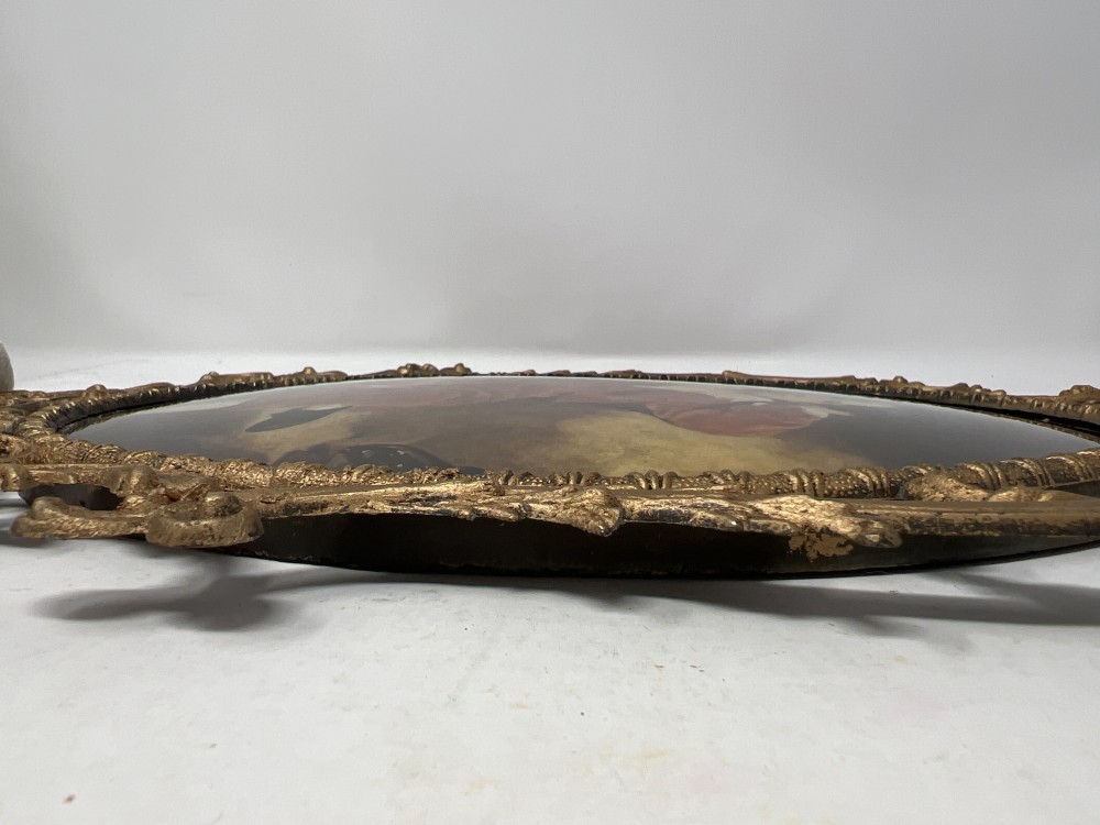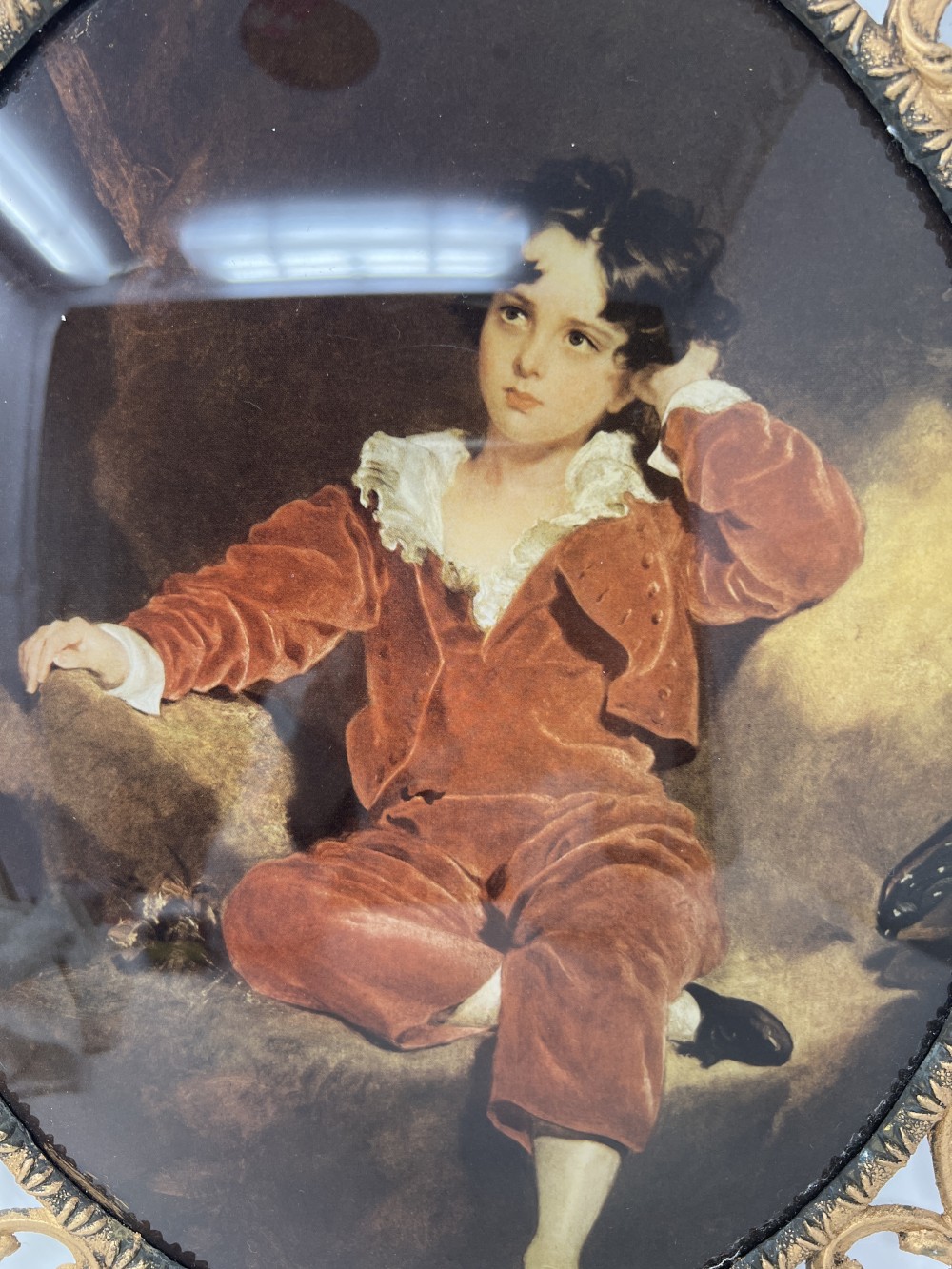 Beautiful vintage reproduction of Thomas Lawrence’s “Master Lambton.” Convex-style glass, set in an ornate Italian-made metal frame featuring elegant scroll and floral detailing. The frame shows light vintage wear, adding authentic character. Backed with felt.