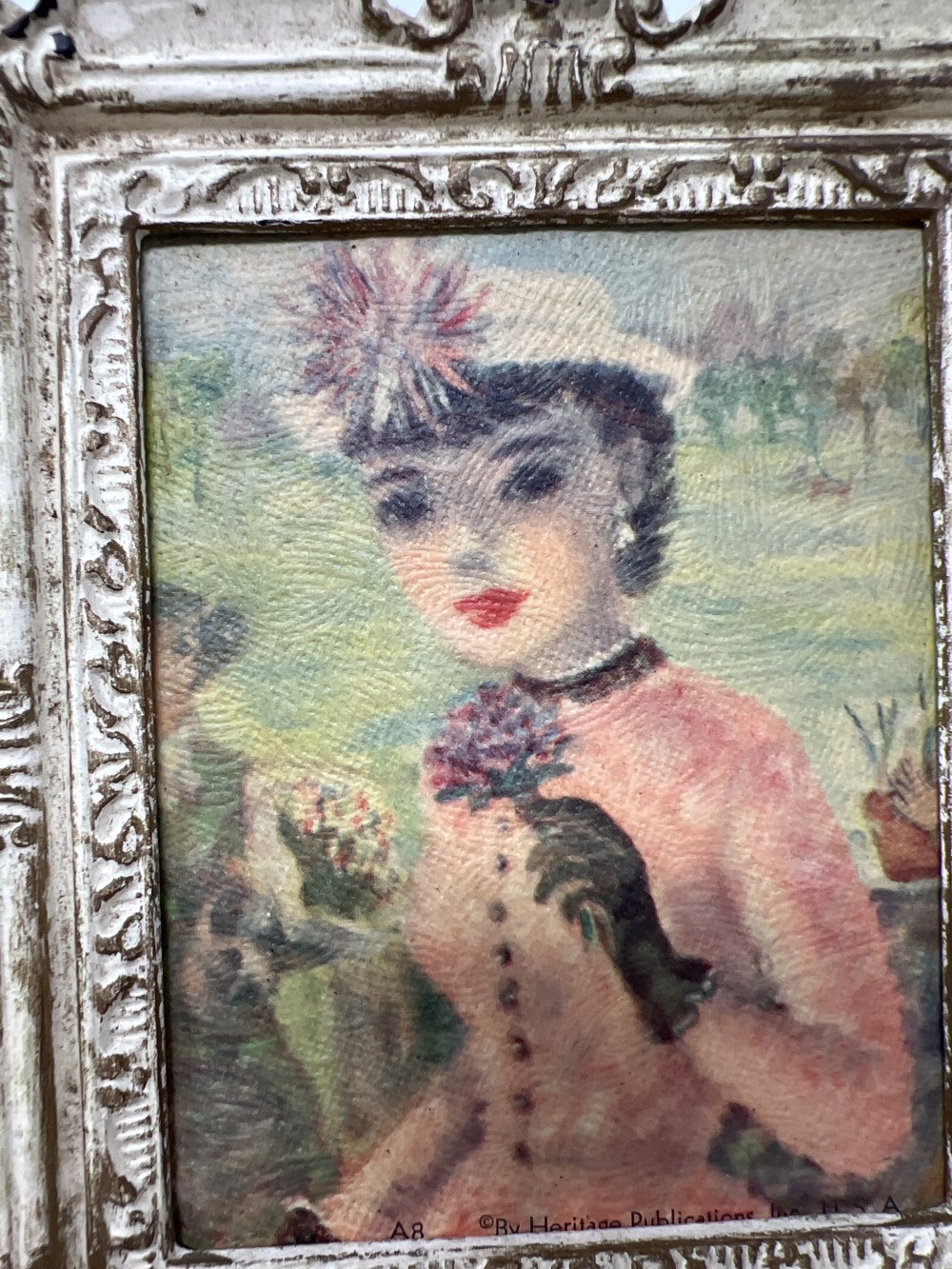 Victorian Lady Decorative Print in Ornate Vintage-Style Frame approx 7” x 8”; Gold-tone molded frame; Published by Heritage Publication USA (A8); includes original hanger; light vintage wear consistent with age.