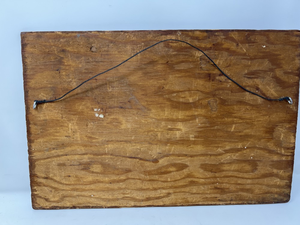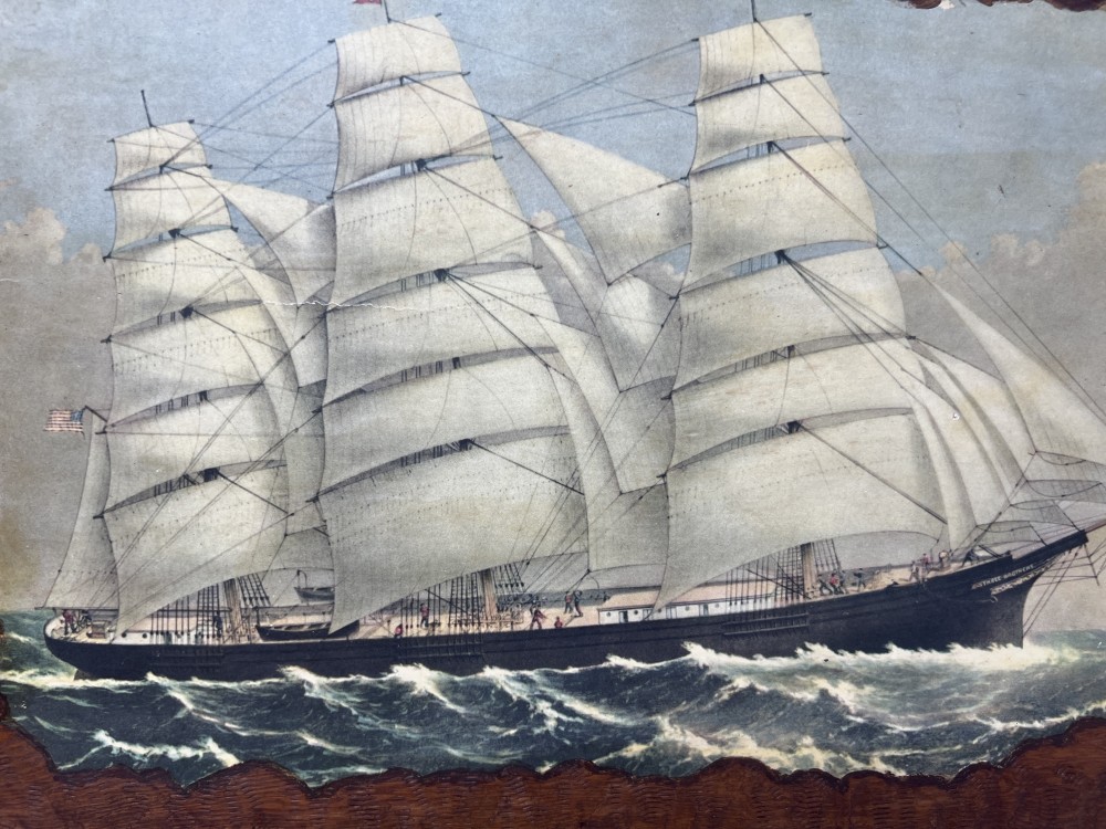 Clipper Ship at Sea — Wood Panel Mounted Nautical Print approx 10.5” x 15.5”; Detailed sailing ship scene in open waters; Printed image mounted to solid wood with natural carved-edge border; Original hanger intact on reverse; no visible maker’s marks; vintage decorative wall art with light age‑appropriate wear.