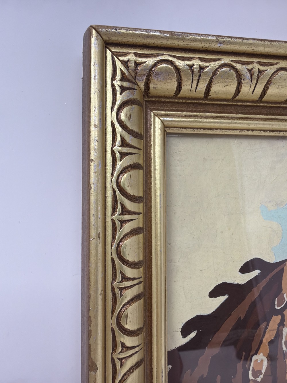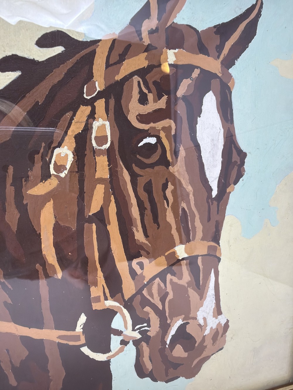 Mid-century paint-by-number horse portrait in an ornate gold-tone frame with original claw hanger. Strong graphic look with warm tones—works well in traditional, western, or eclectic spaces.