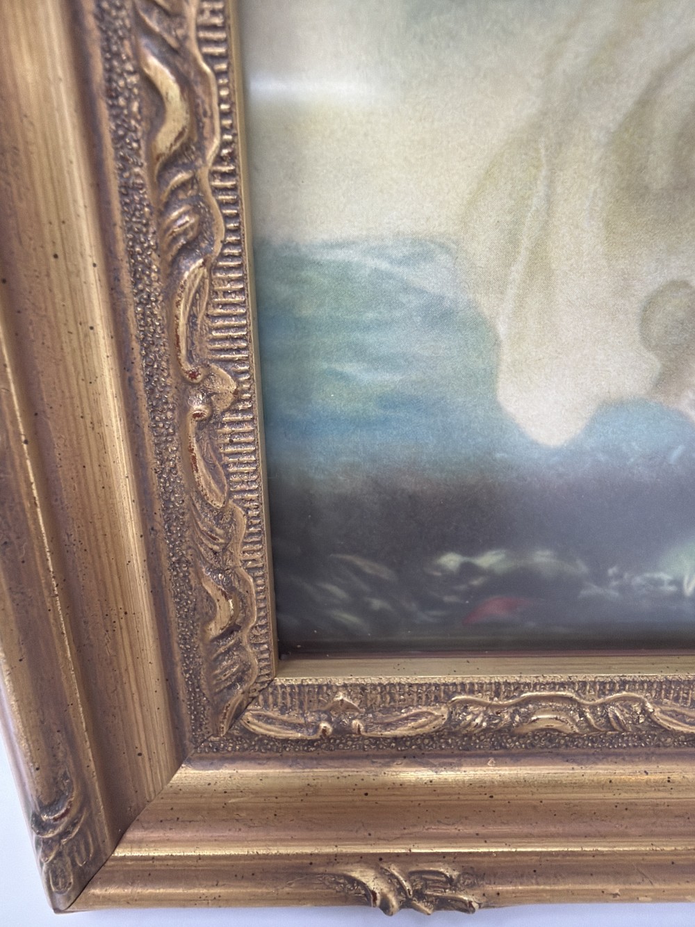 Soft, romantic figure set in a pastoral landscape, housed in a detailed gold-tone frame under glass. A classic pairing with traditional interiors or gallery walls.
