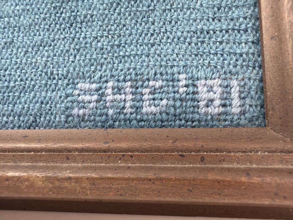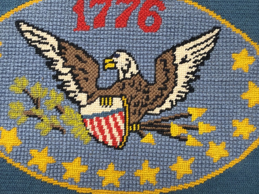 Framed needlepoint featuring eagle, shield, and stars with “1776” motif. Wood frame.