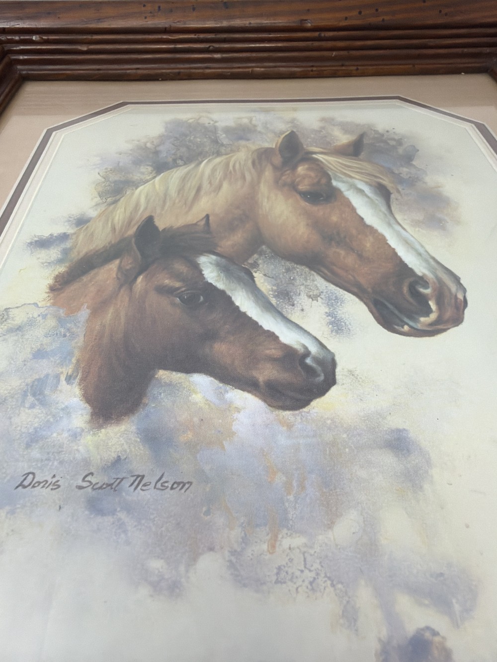 Framed print signed Doris Scott Nelson featuring mare and foal portrait. Wood frame.