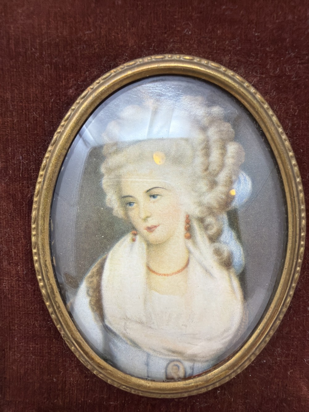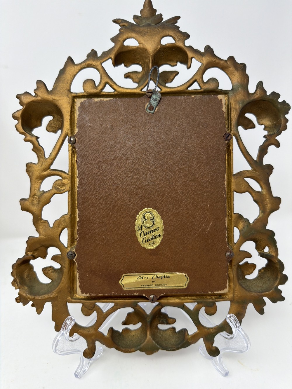 Ornate gold-tone resin frame with scrolling detail, featuring a convex glass oval portrait of Mrs. Chaplin after George Romney. Rich velvet-look mat adds depth and contrast. Ready to hang.