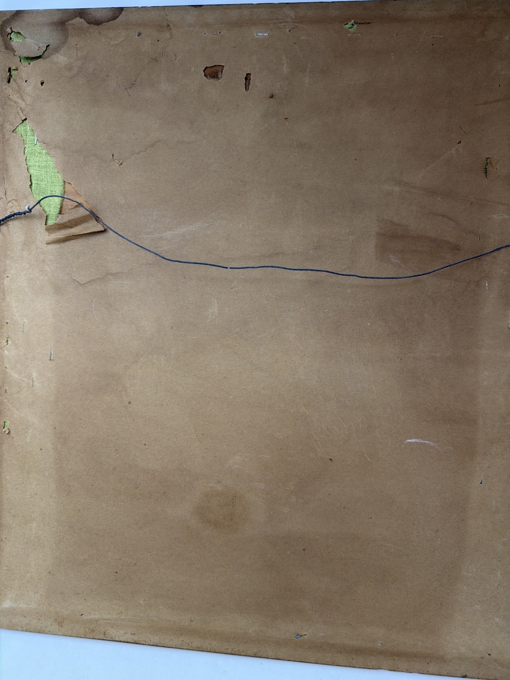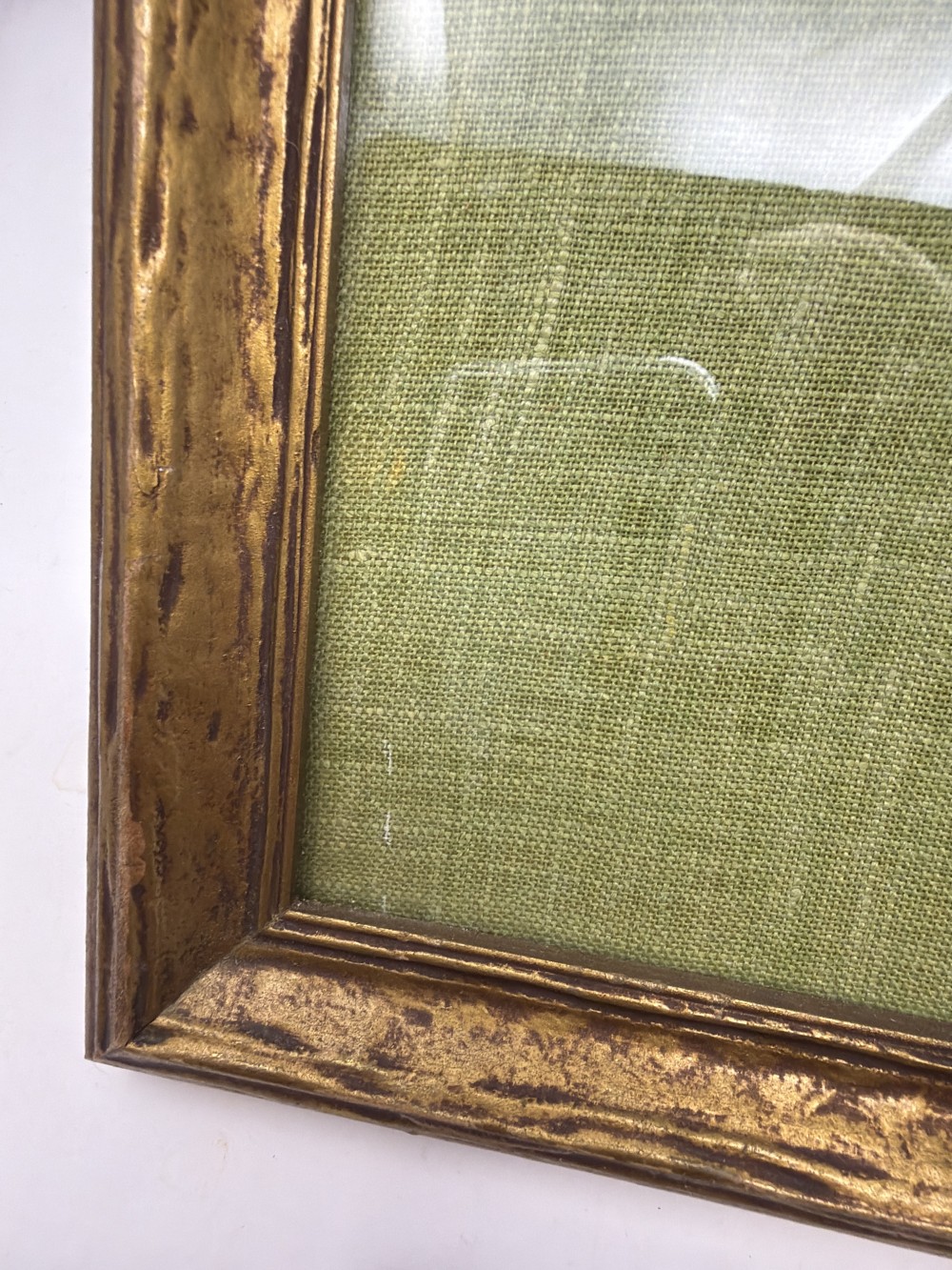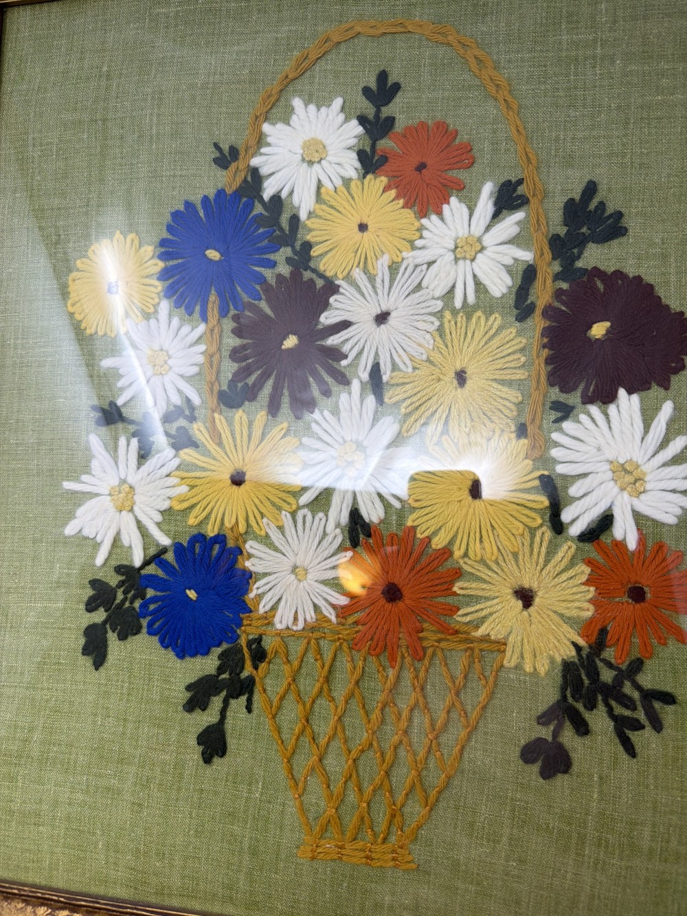 Vintage crewel embroidery featuring a colorful floral basket on a green background. Approx. 19.5” x 21.5”