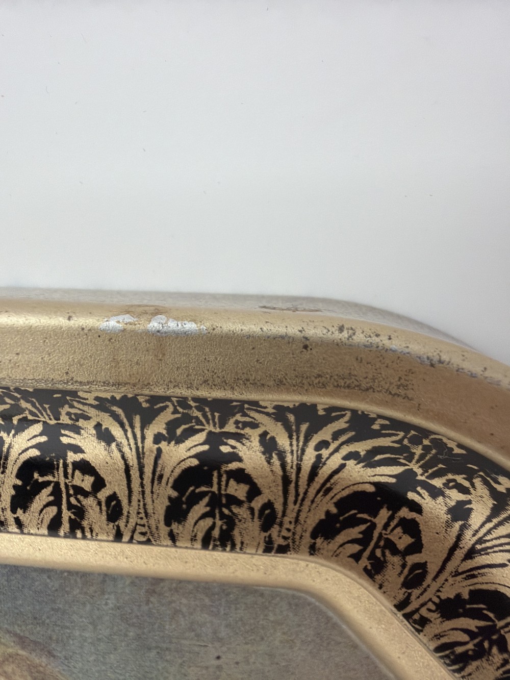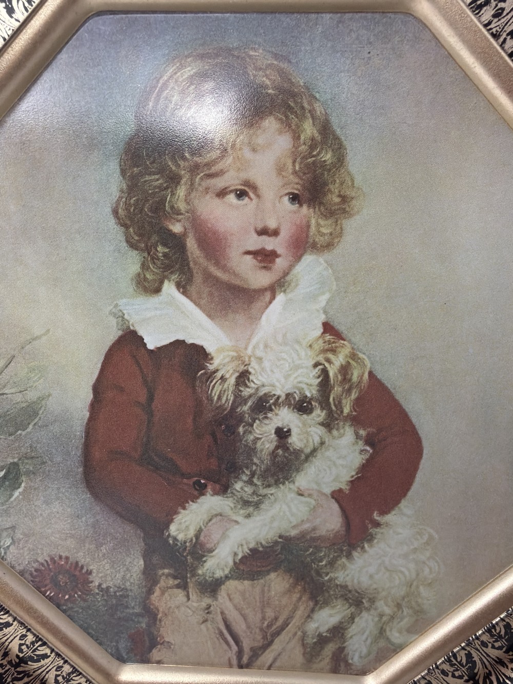 Vintage Victorian Print Tin Wall Art Boy W Dog Master Simpson Picture; Metal wall hanging; approx 12”- Patina as shown