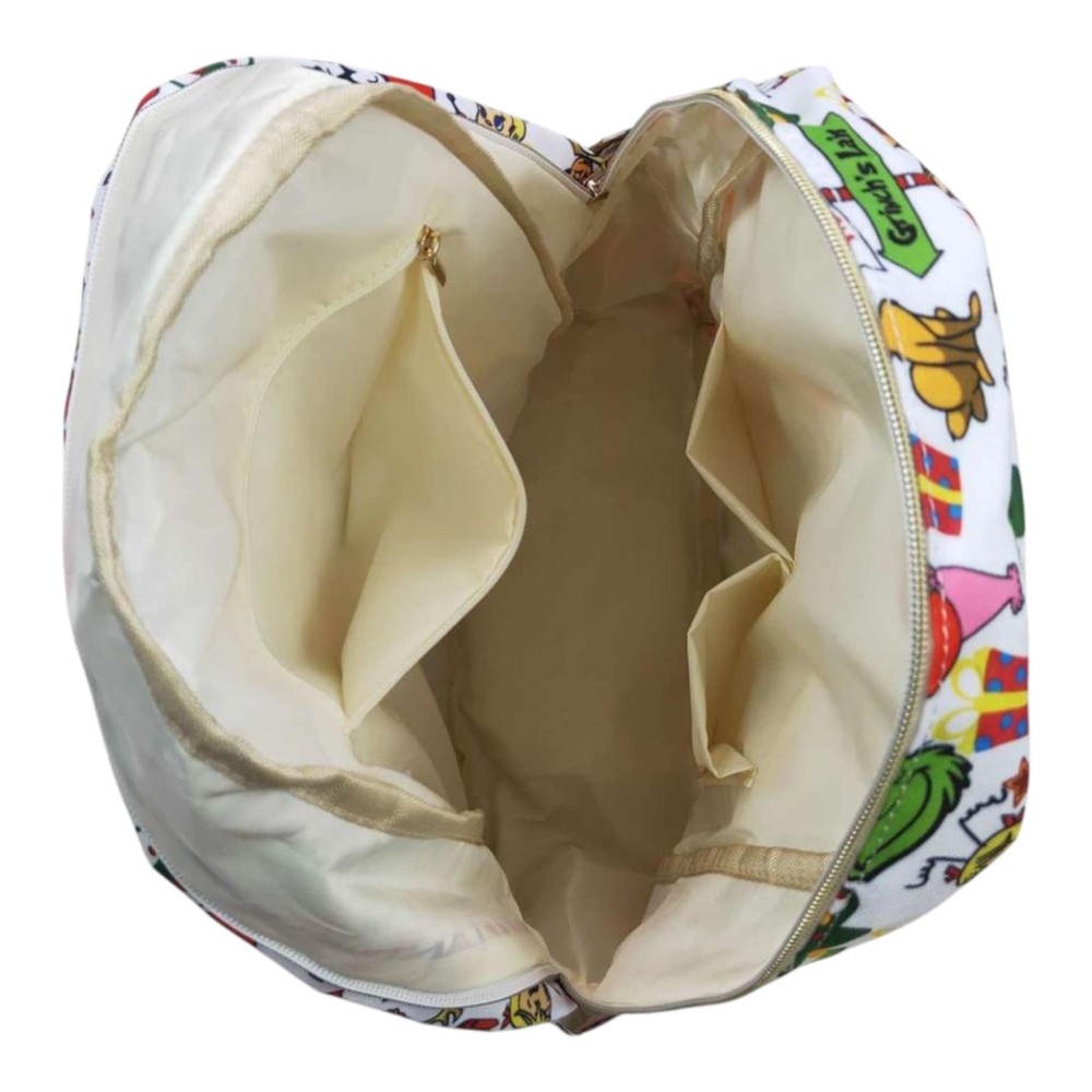 Backpack is lined.Zipper pocket inside and in front.Cup holders on each side.Straps are adjustable.