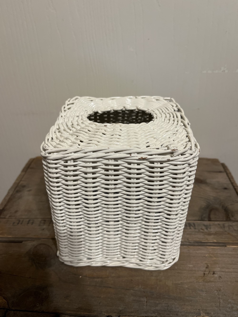 Vintage white wicker tissue box cover, holds a square cube tissue box. This item is preowned in good vintage condition with a few nicks in the white paint, but very sturdy. Perfect addition for shabby chic or cottage core decor!