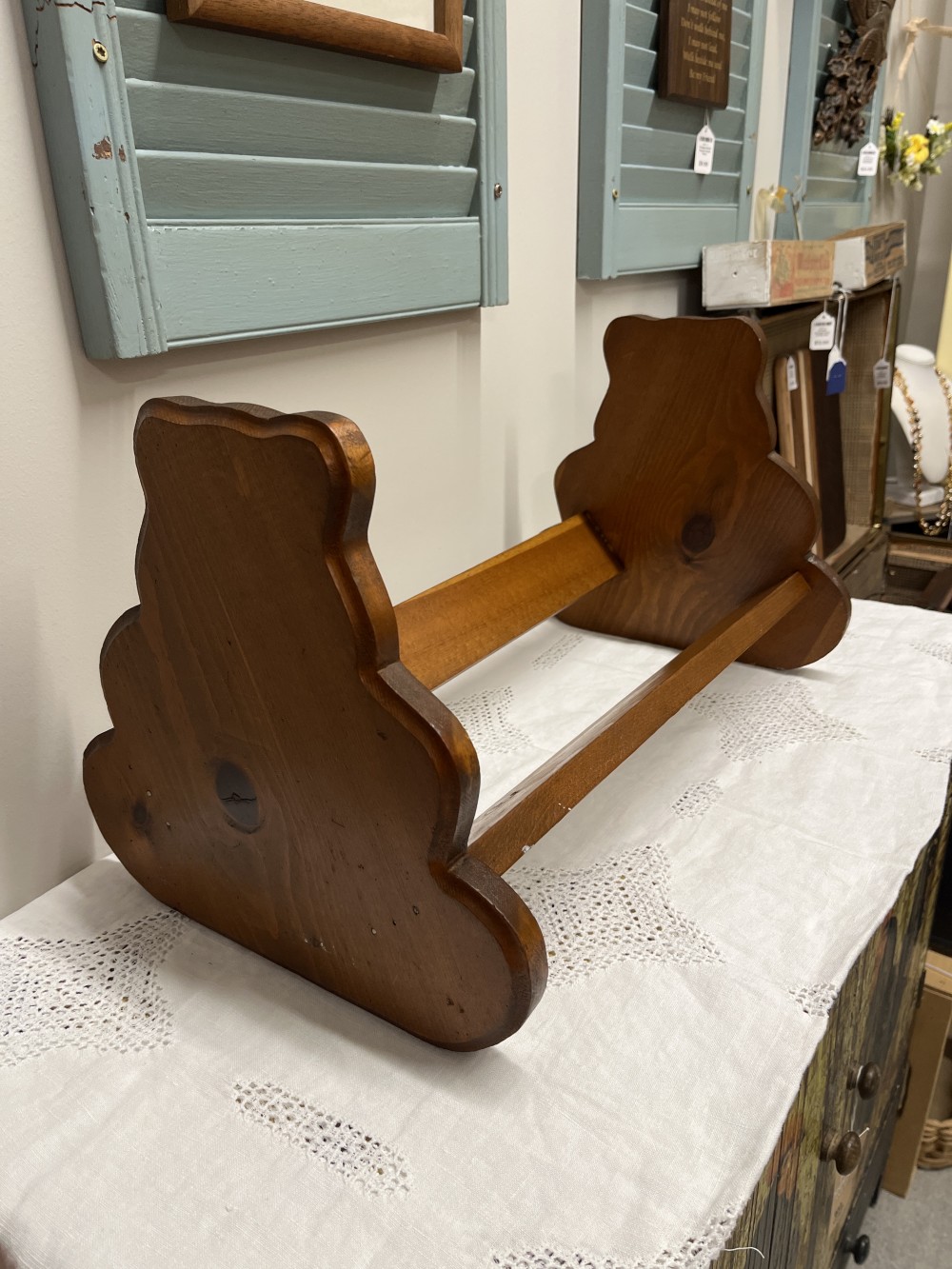 Vintage handmade wood teddy bear bookrack. Very good condition. Measures 19 inches long by 11.5 inches wide.