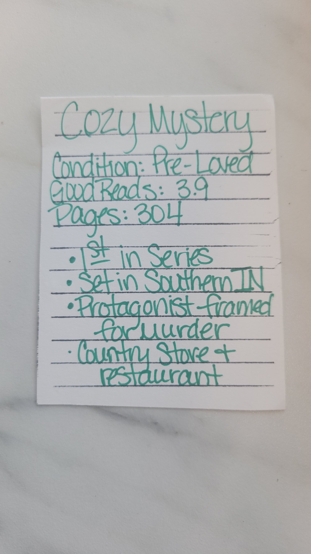 Clues: 1st in series, set in Southern Indiana, protagonist framed for murder, country store & restaurant