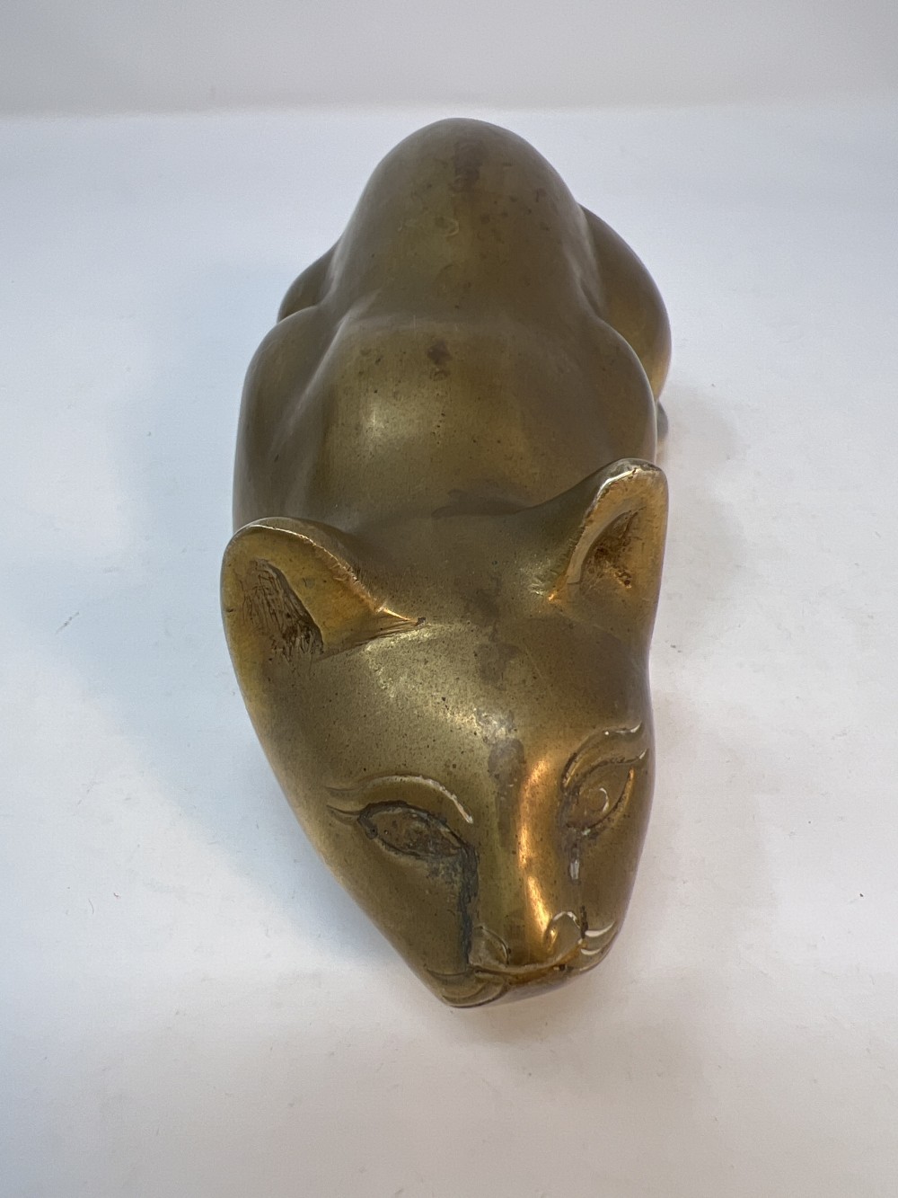 Vintage Solid Brass Crouching Cat Paperweight Mid Century 6.5” w/ Patina