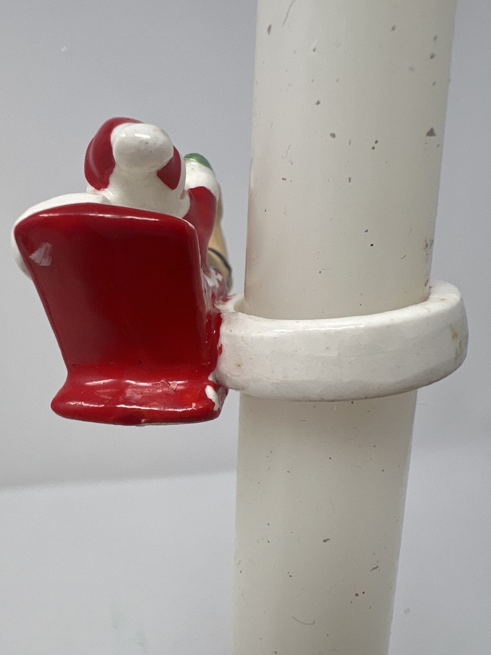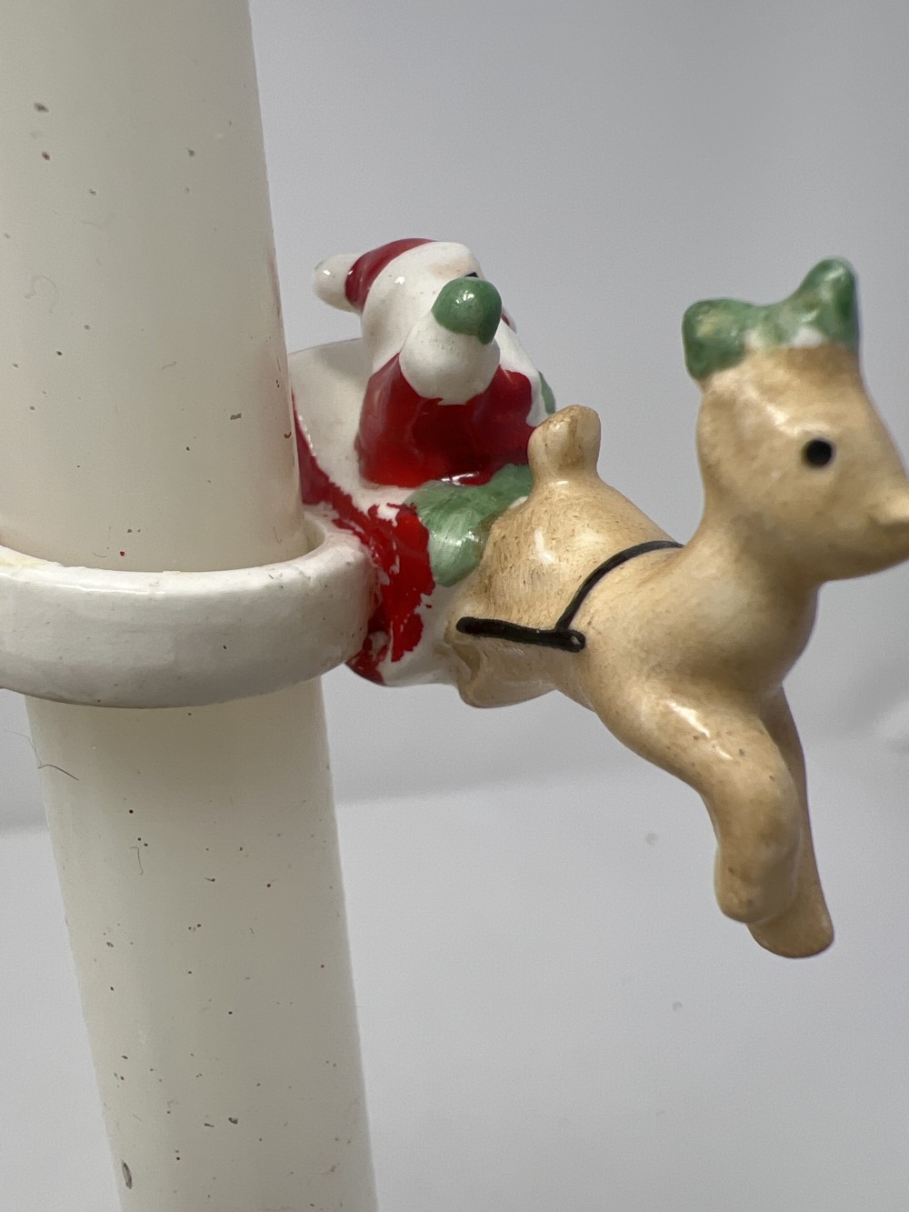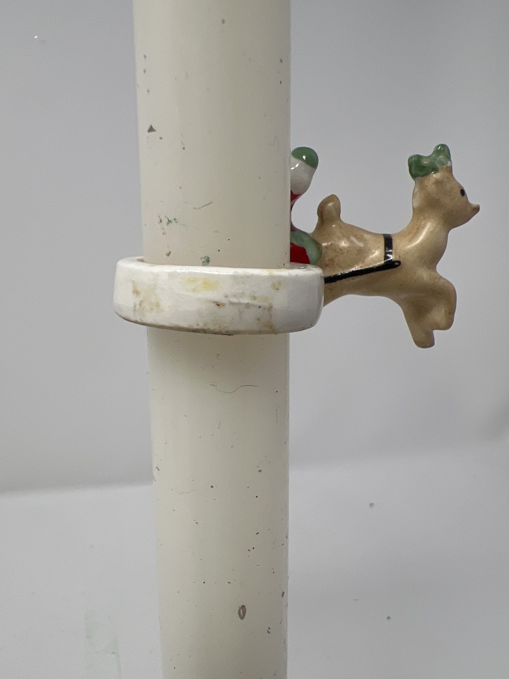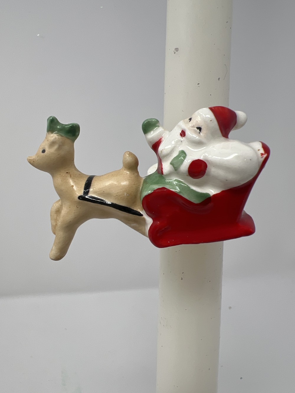 Brass Candleholder with vintage ceramic Santa Claus and reindeer candle wrapper on white candle - AS IS