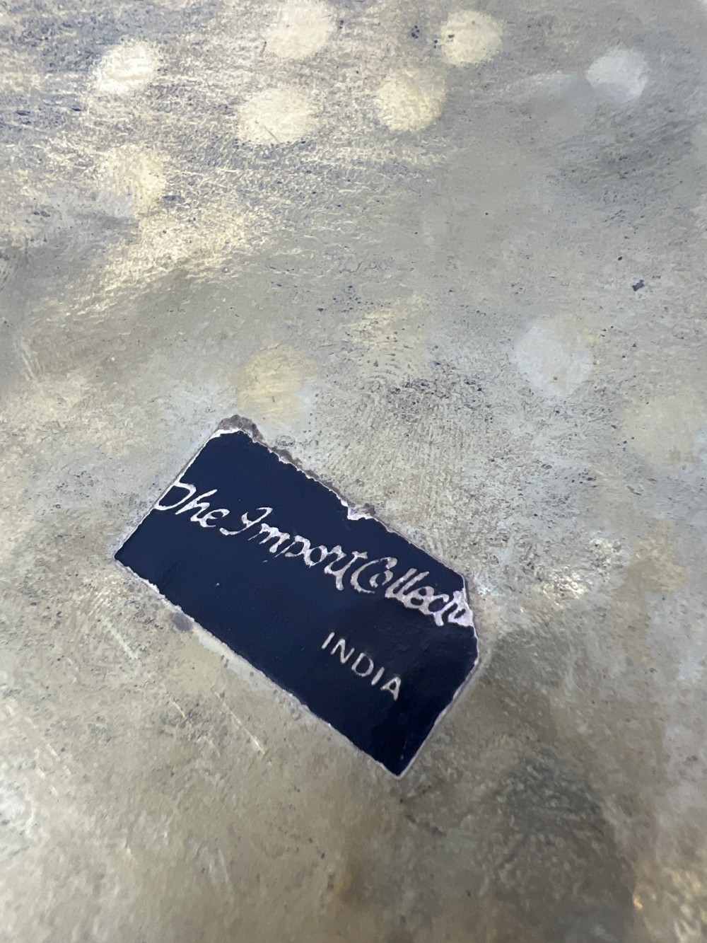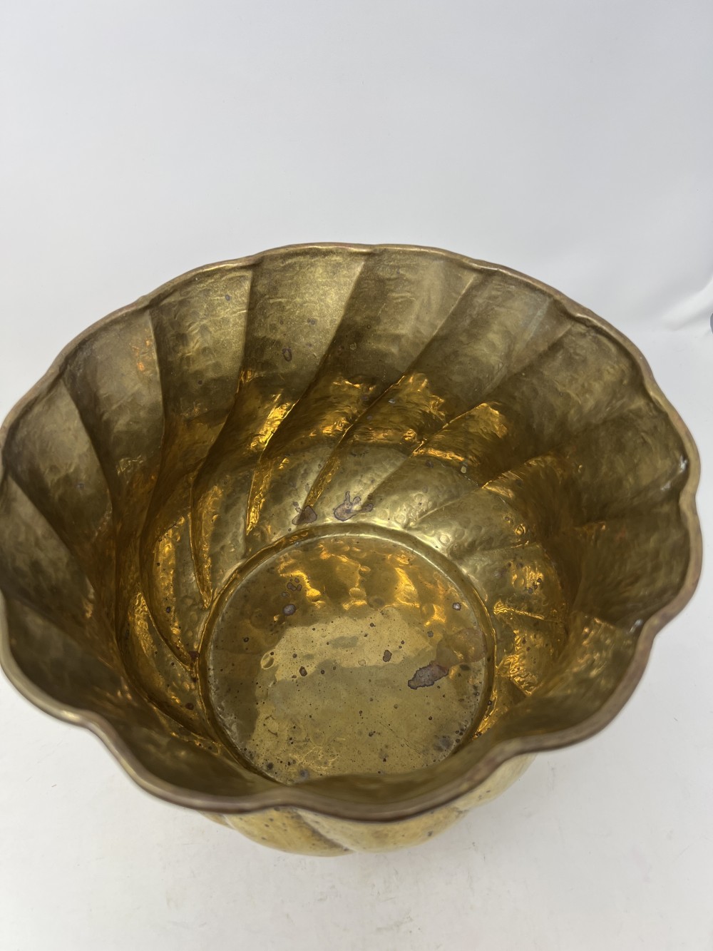 Hammered Brass Decorative Planter from The Import Collection, India approx 7” tall x 10” wide; Scalloped rim with spiral fluted sides; Warm aged brass patina; Lightweight decorative form suitable for plants or display; vintage wear consistent with age.