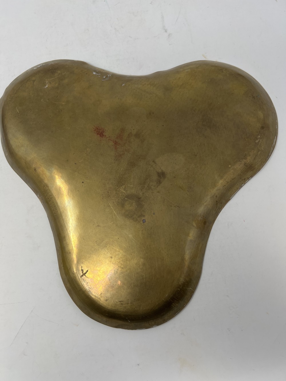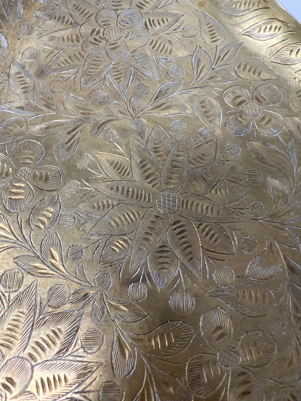 Solid brass tray with an organic, clover-like shape and hand-etched floral detailing throughout. Warm patina with light age wear that adds character and depth. Perfect for a coffee table, vanity, bar cart, or layered into a gallery wall.