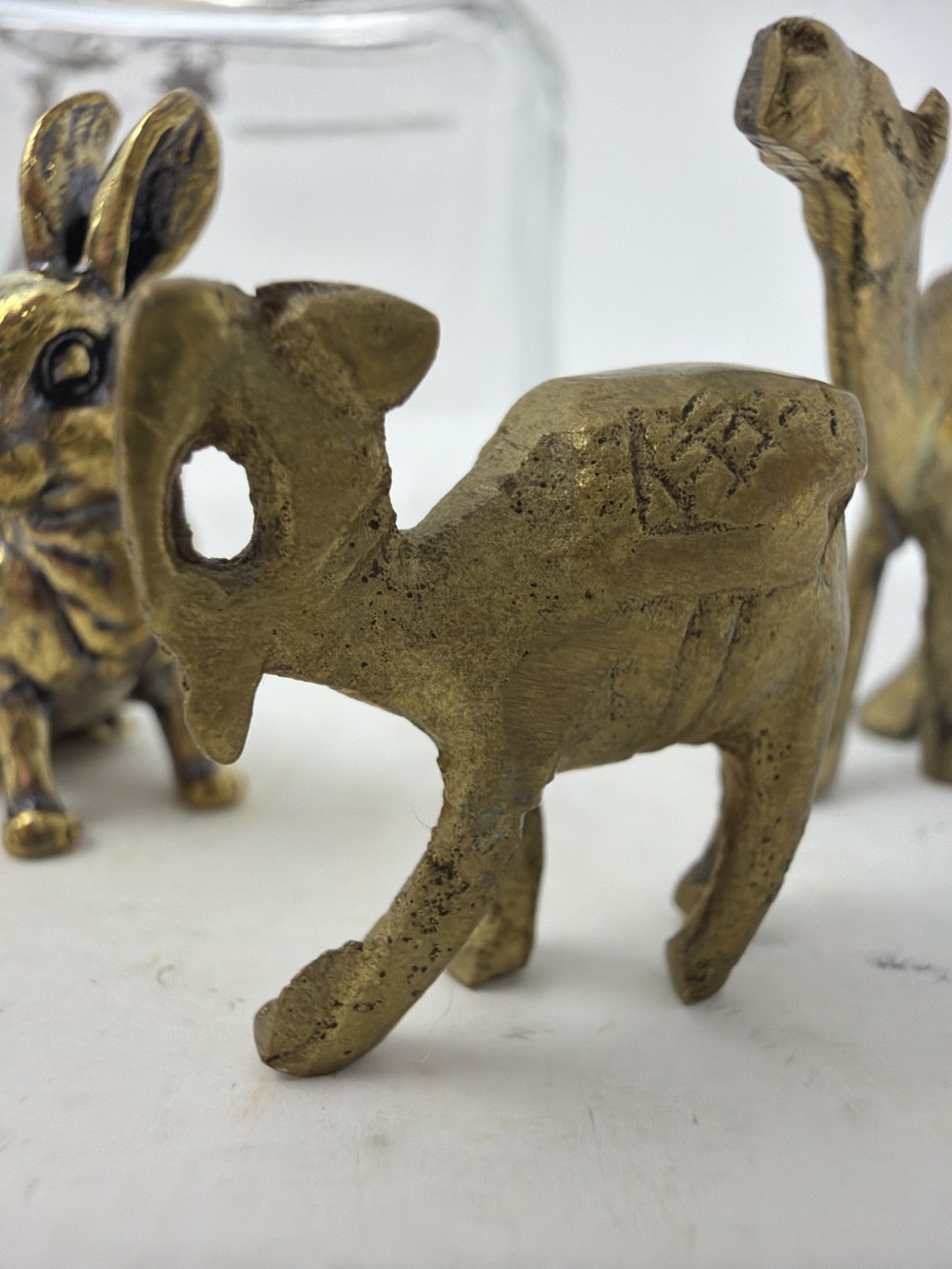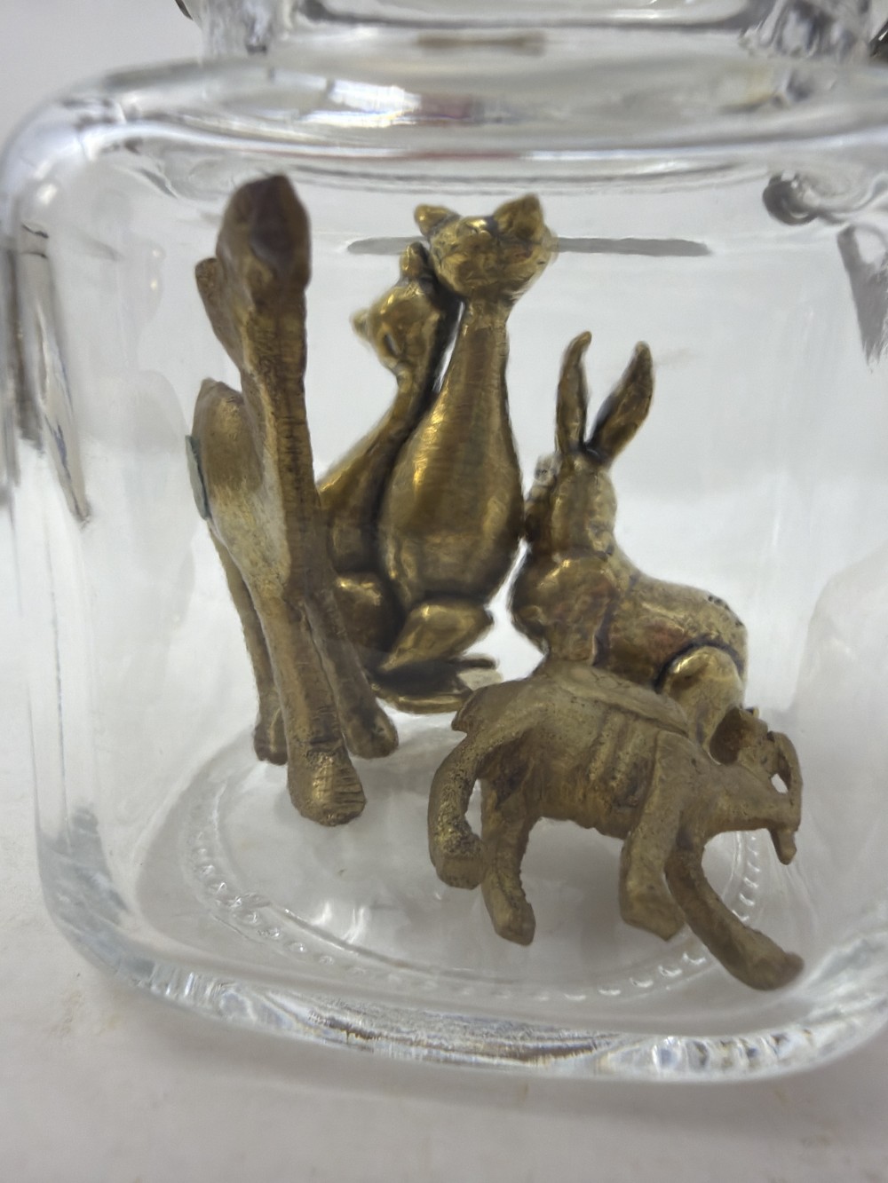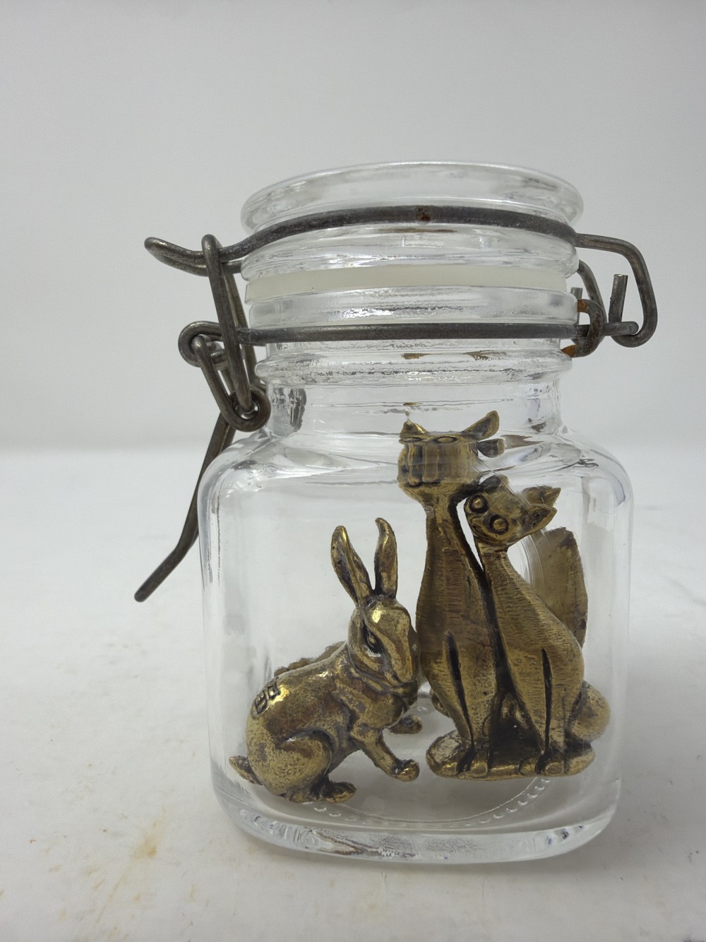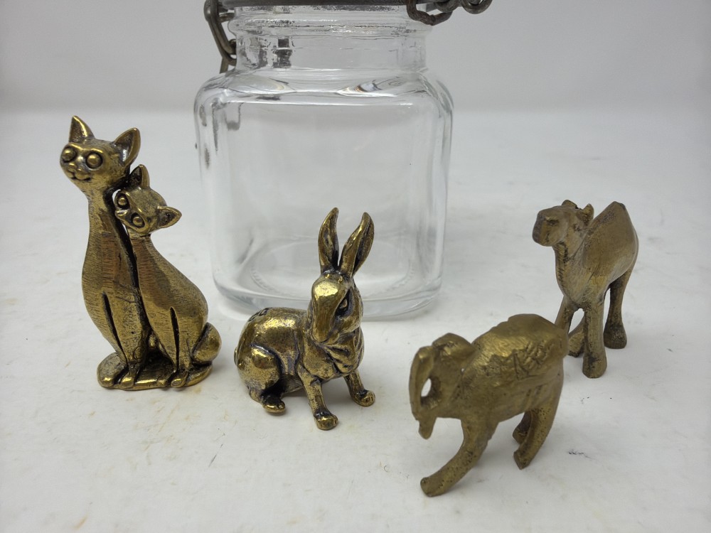 Mini Brass Animals in Jar - Two cats; rabbit Camel and camel; jar is approx 3.25”