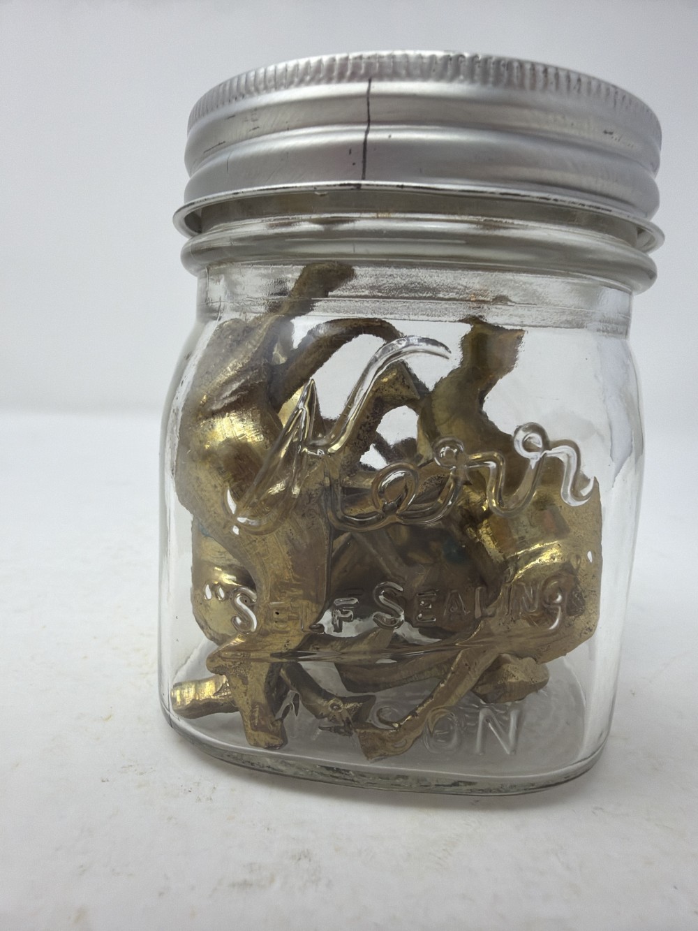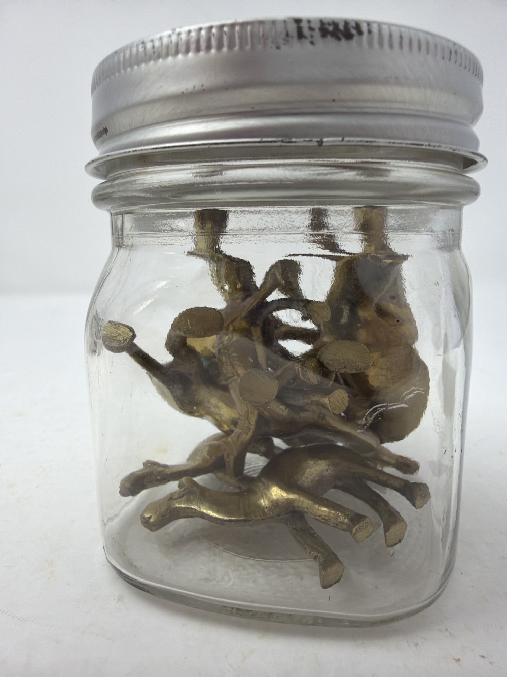 7 Mini Brass Camels in Jar; jar approx 3.5”