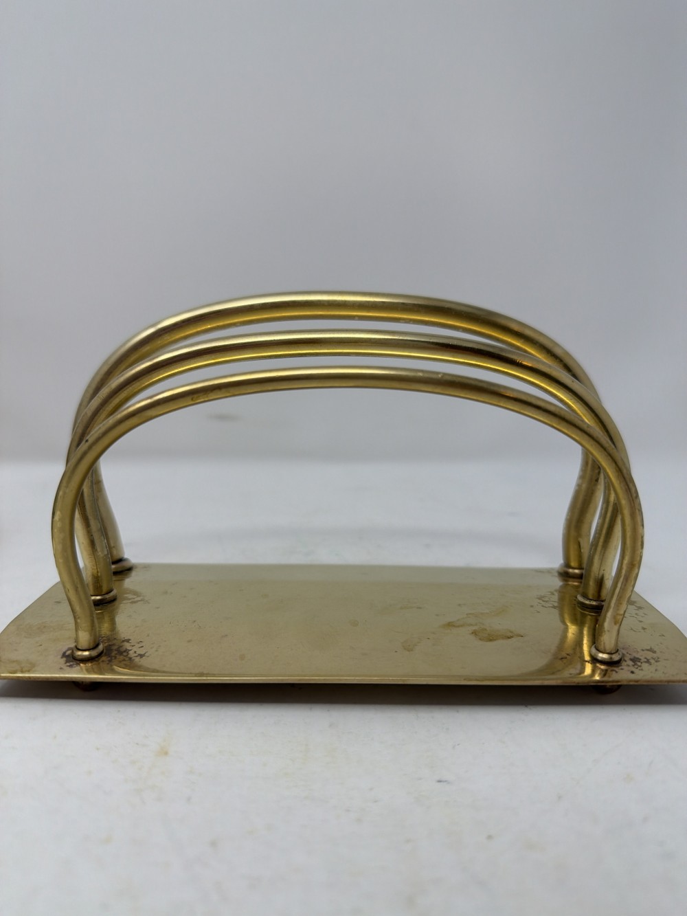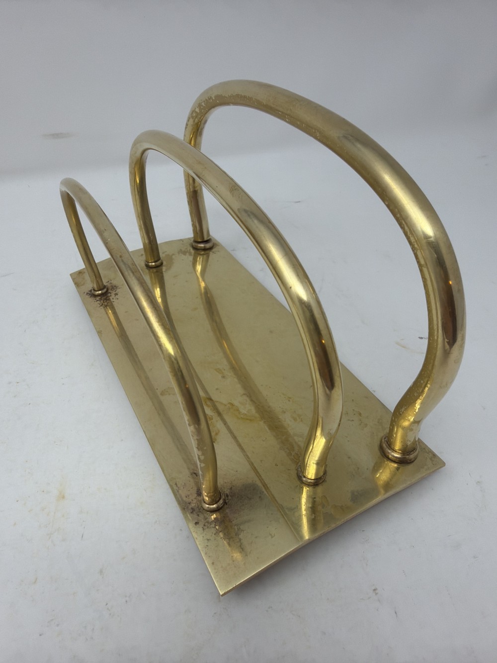Solid brass desk organizer with graduated arch dividers for mail or papers. Marked Made in England.
