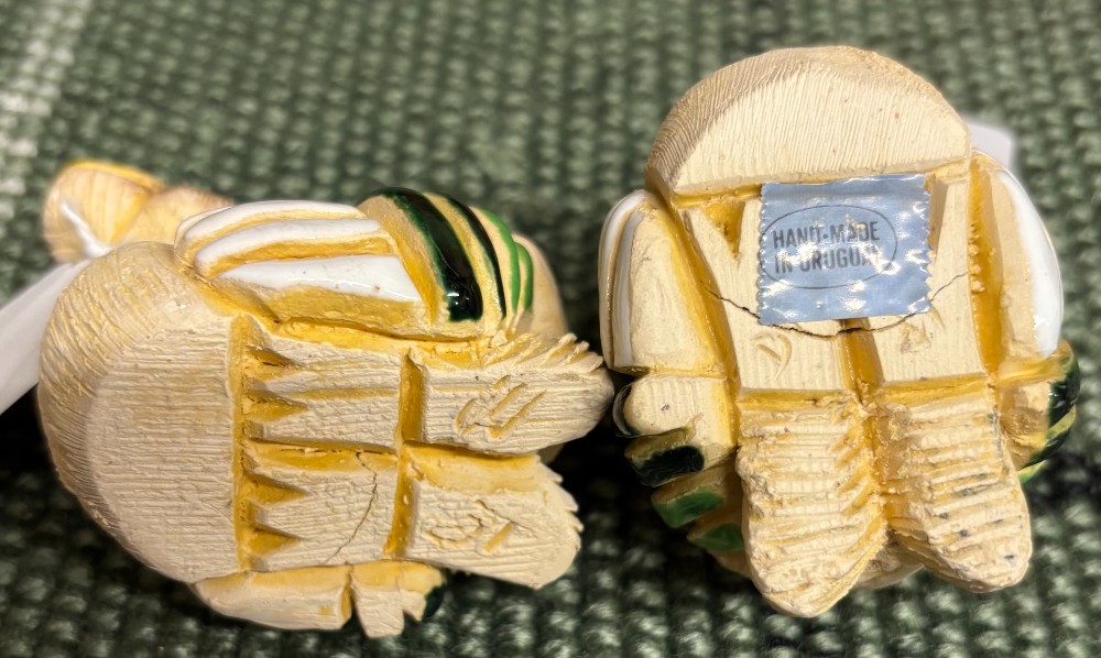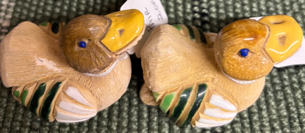 Artesania Rinconada Uruguay Clay Pottery Duck set of 2 figures, vintage and retired in very good condition. Sand clay with gloss brown, green, white and yellow glaze. 2.5"T x 2.75"L x 2"W. Uruguay label on one.