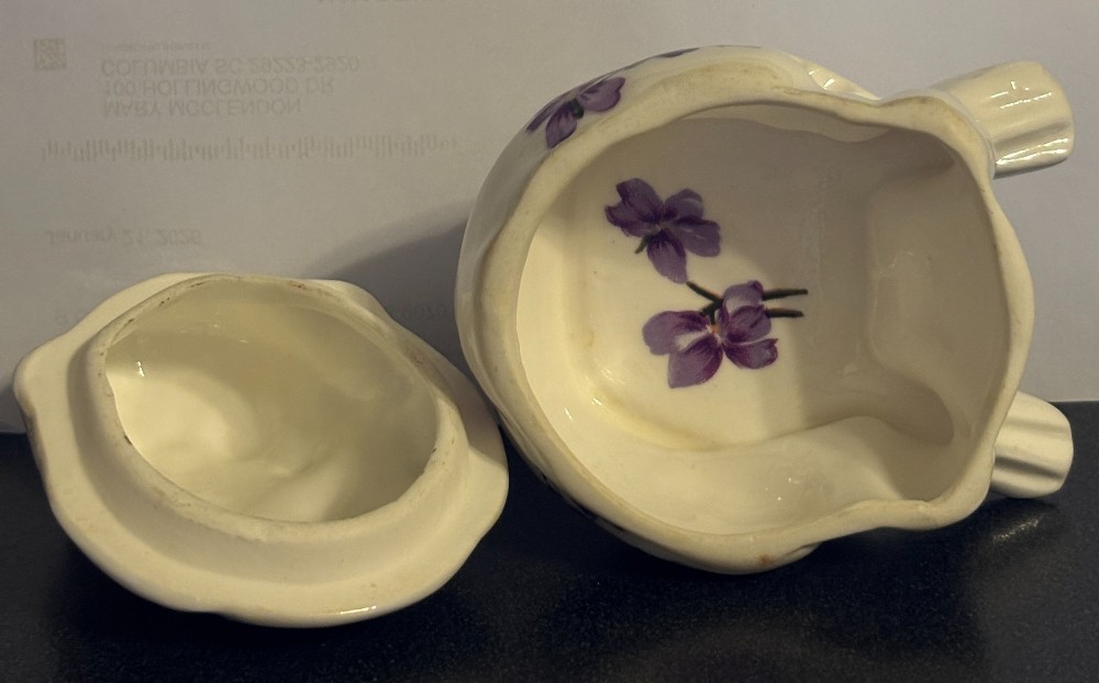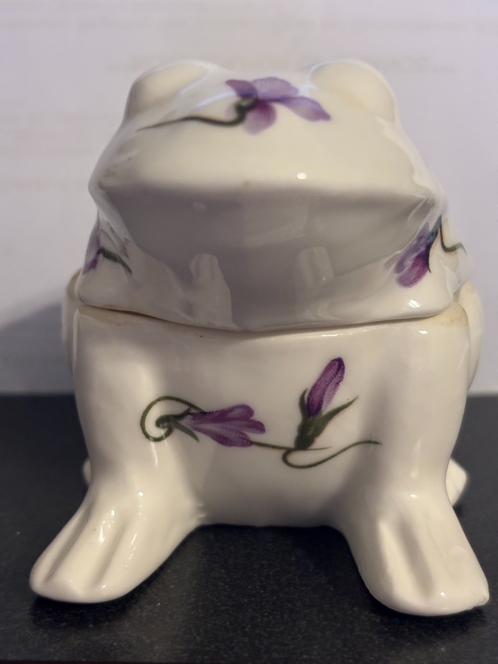 Porcelain white wtih violets frog covered trinket dish.3.5"T x 4"L x 3"W