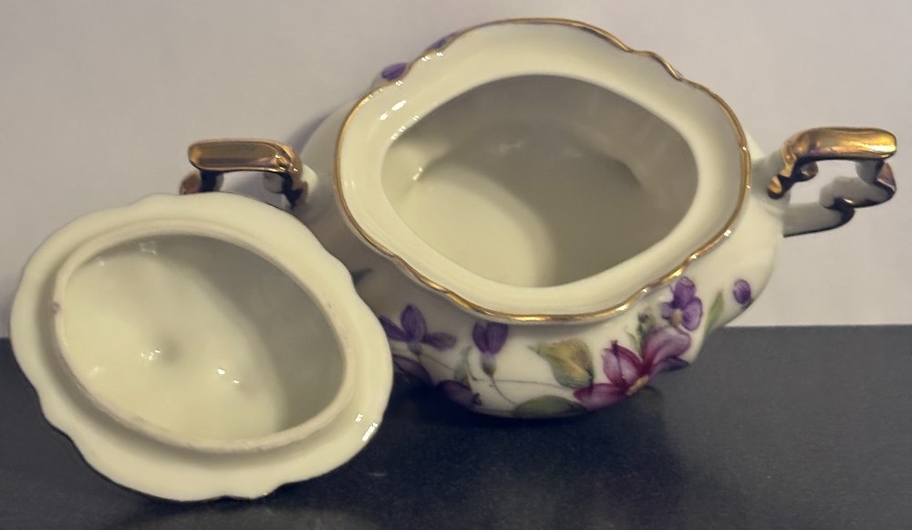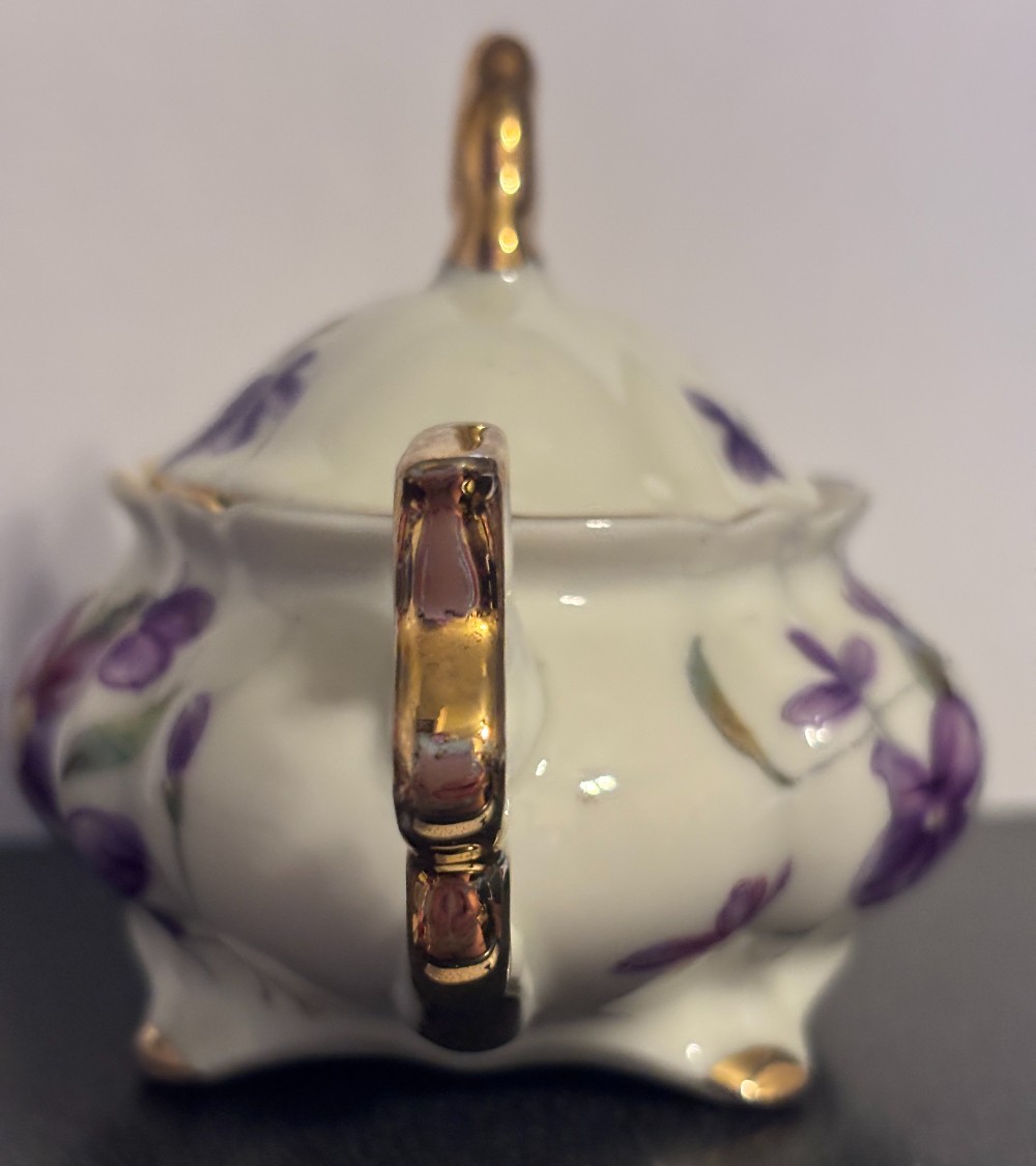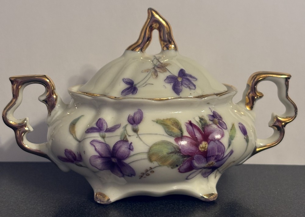 Porcelain ribbed white with violets and gold trim sugar bowl and lid3.5"T x 5"L x 3"W