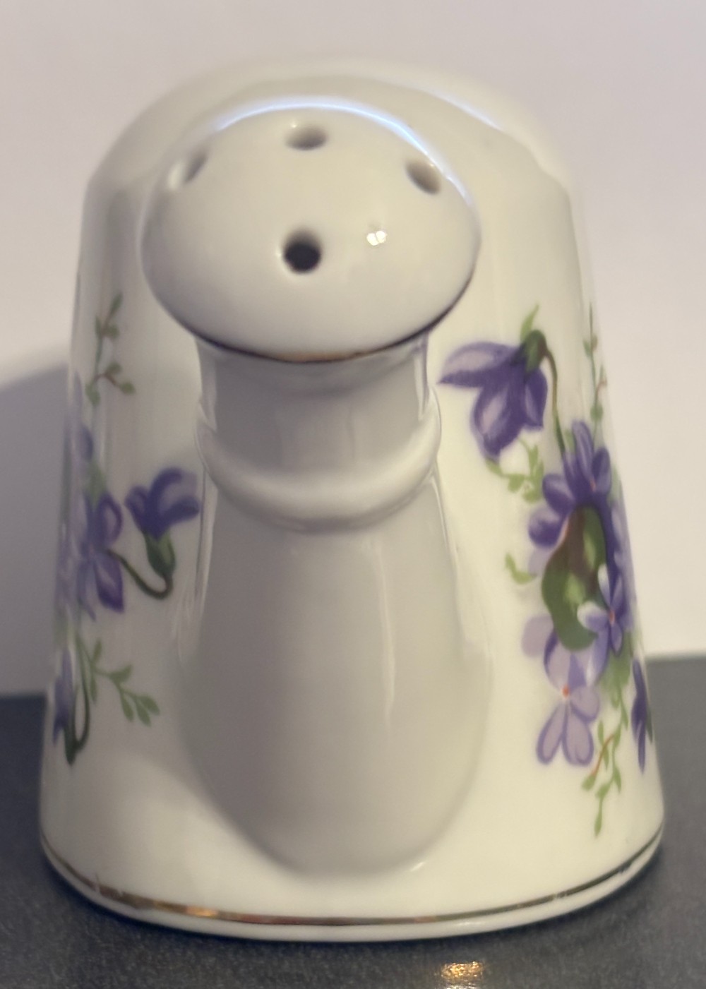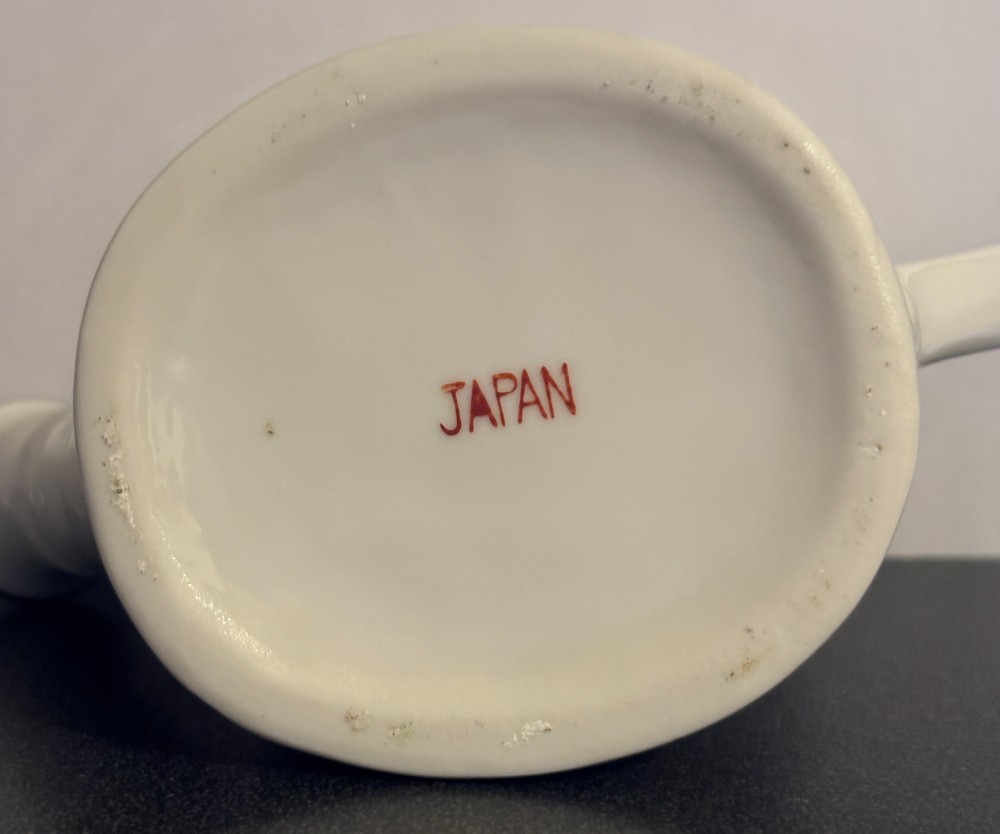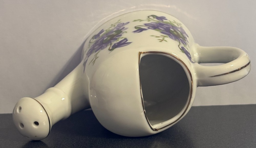 Porcelain white with violets and gold trim watering canMarked Japan4"T x 6"L x 3"W