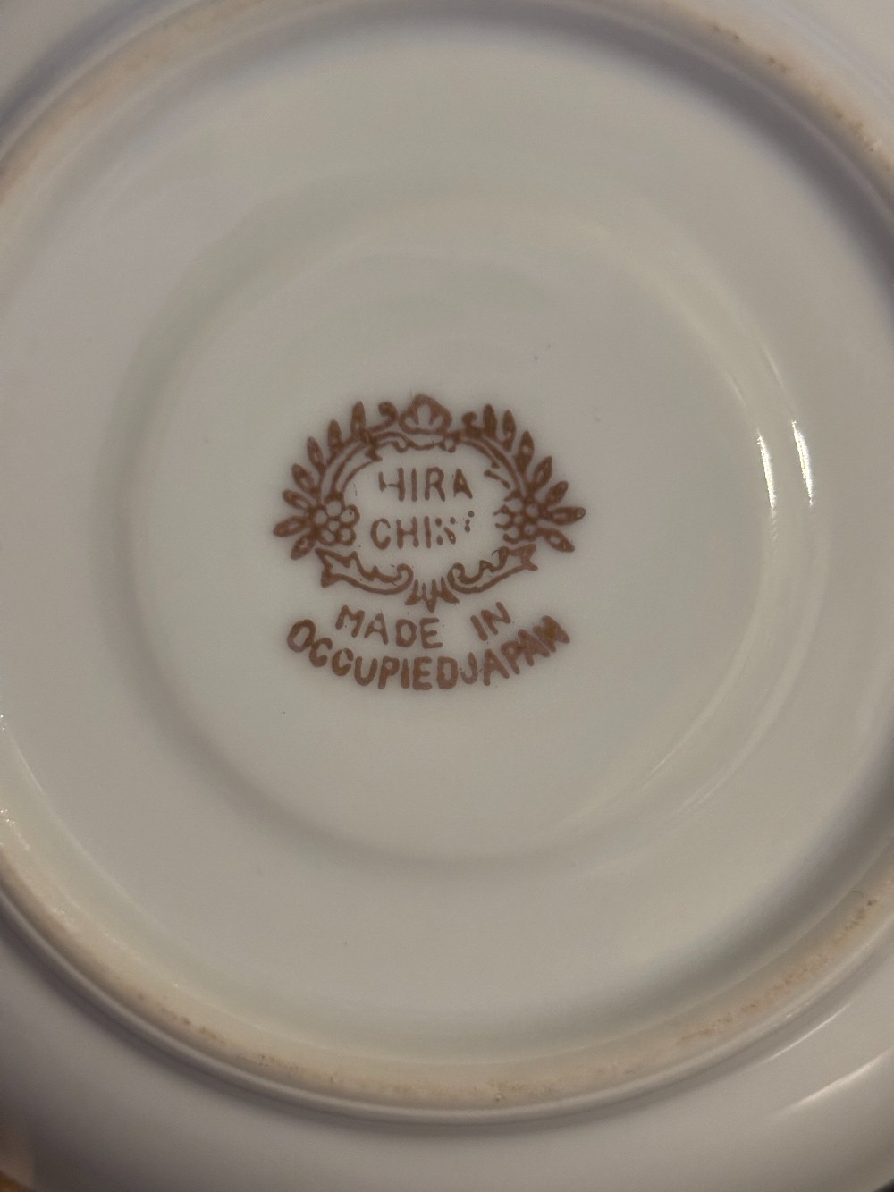 Hira China porcelain white & pink with violets and gold trim saucer. Includes gold wood stand.