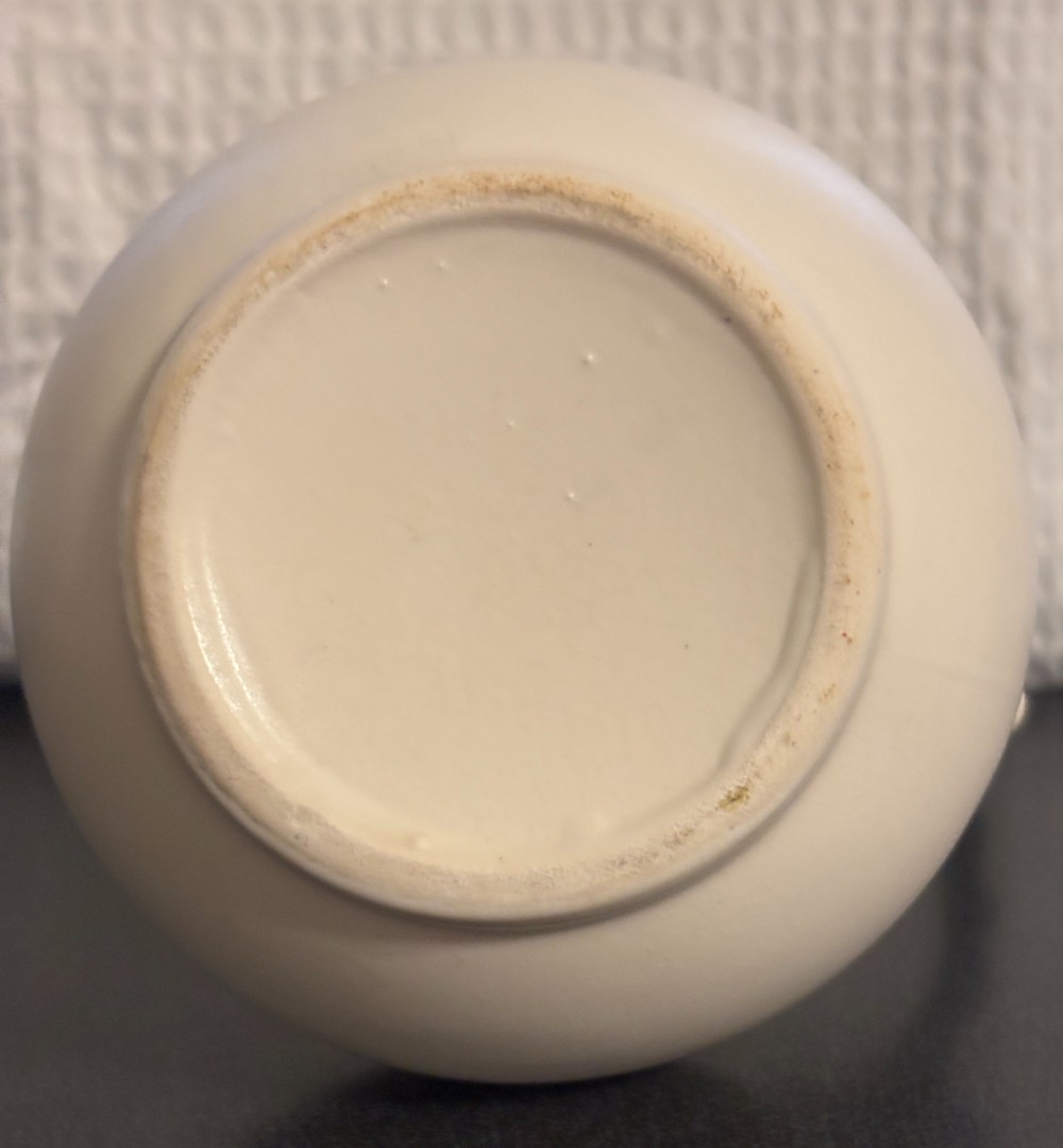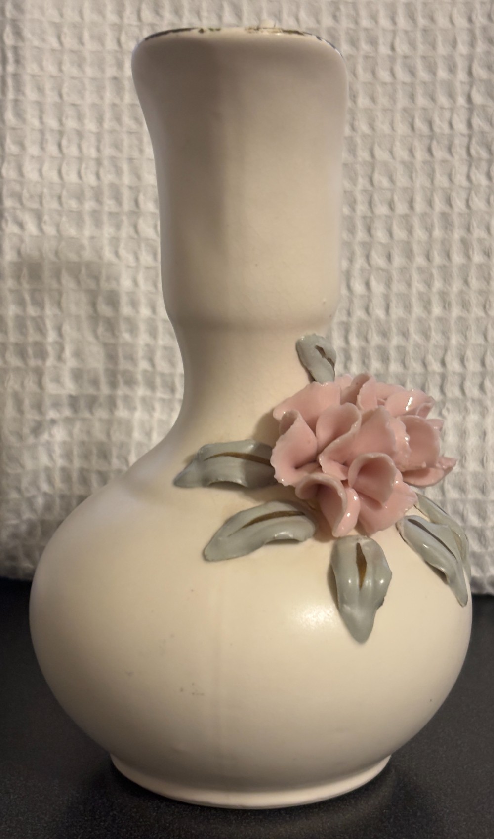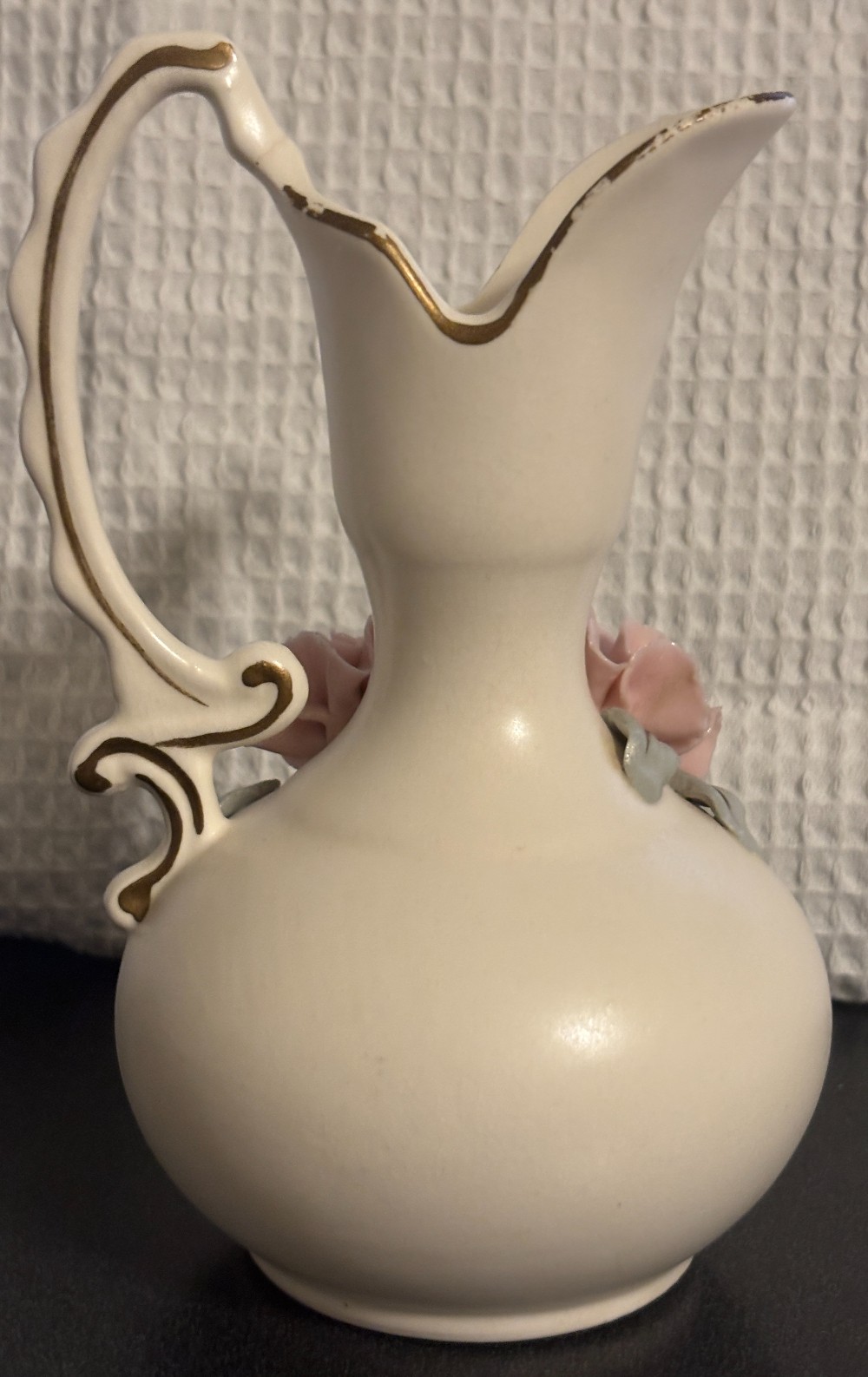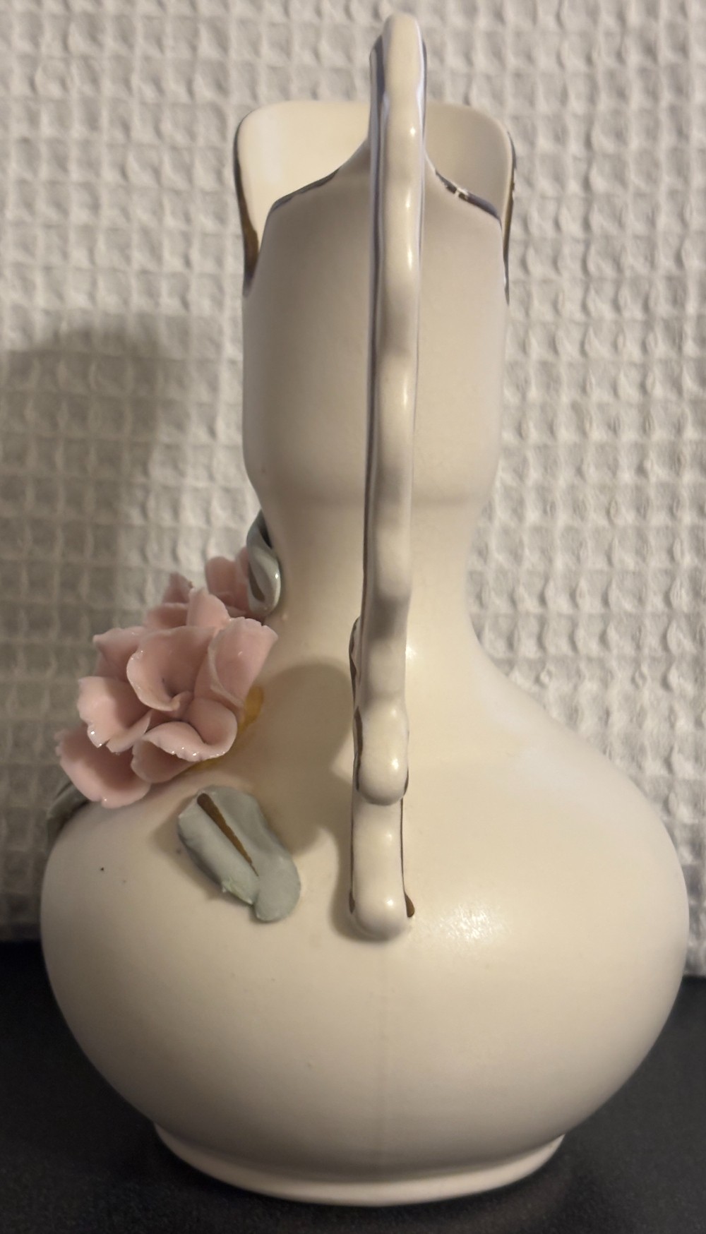 Porcelain ivory narrow neck pitcher with applied 3D pink flowers, green leaves and gold trim.7.5"T x 4.5"W