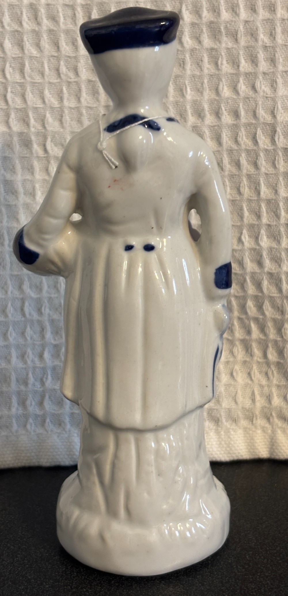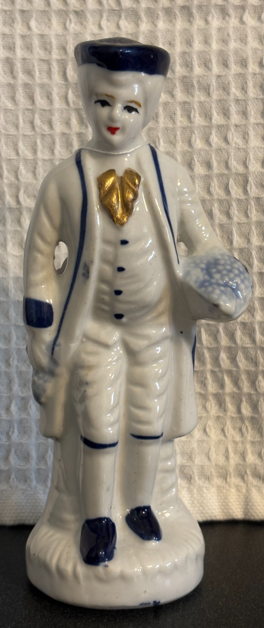 Blue and white porcelain gentleman with ponytail and gold trim.6.25"T x 2"W