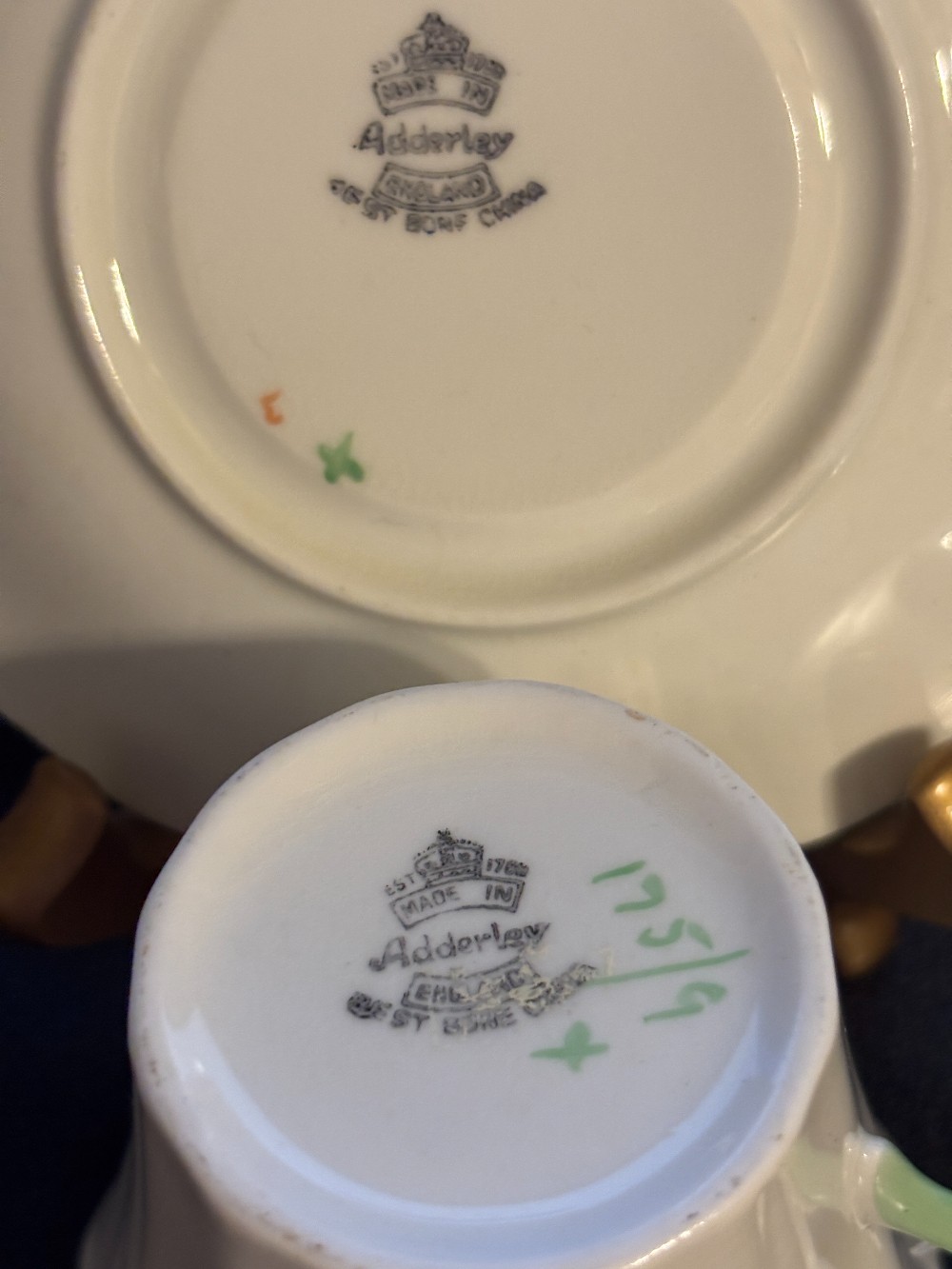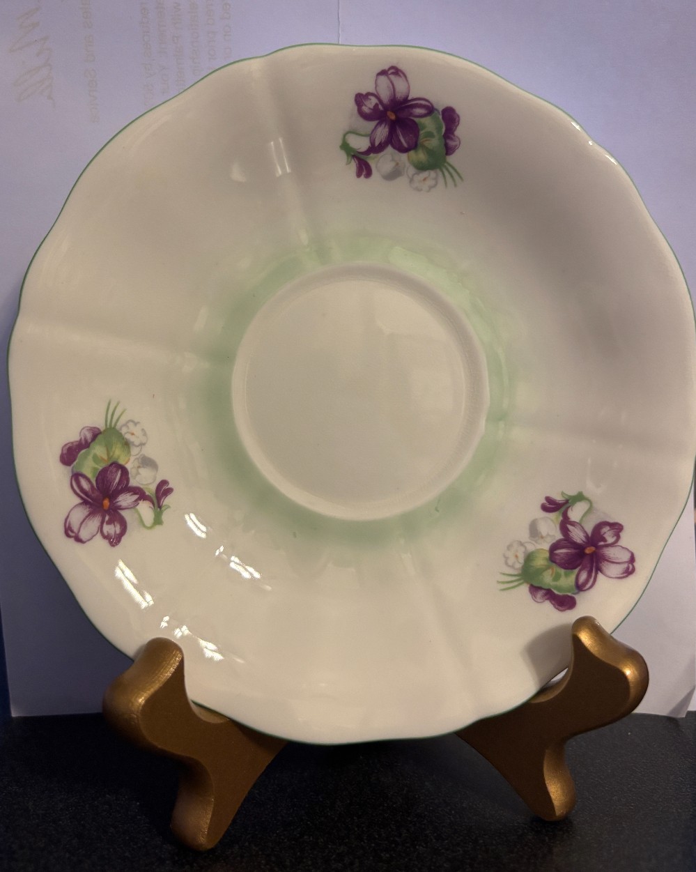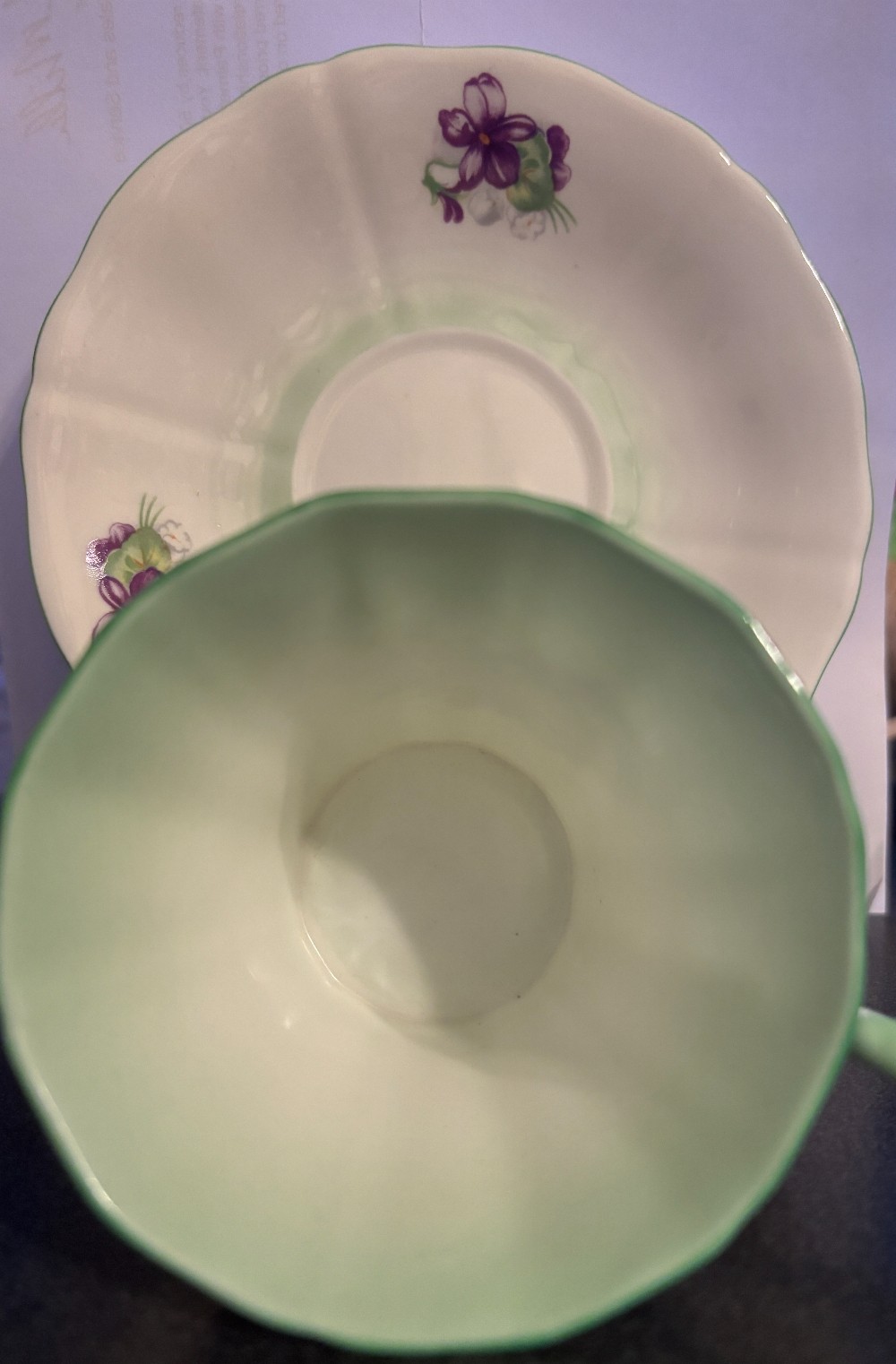 Adderley bone china white and pale green with violets cup and saucer. Made in England. Marked.