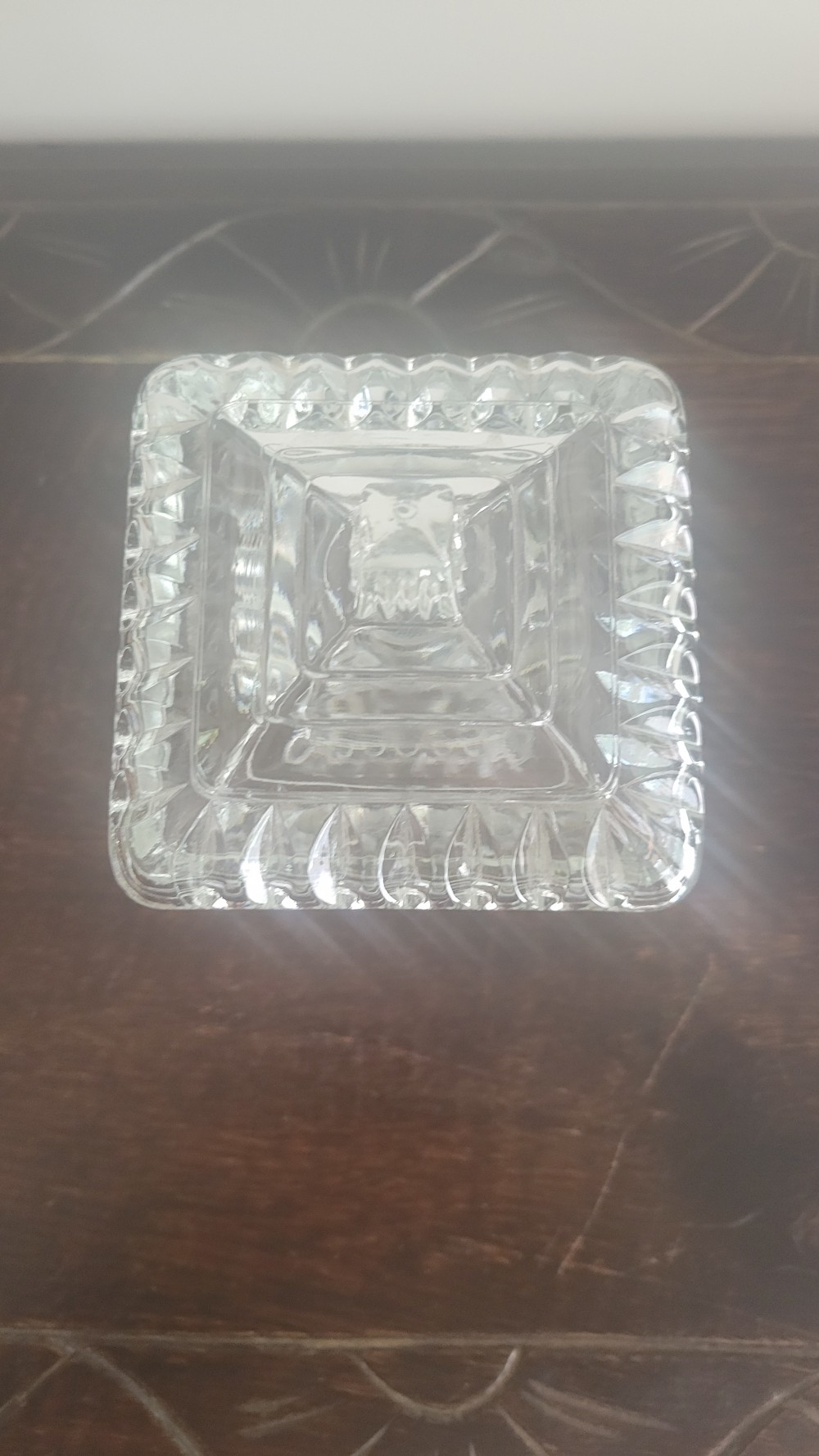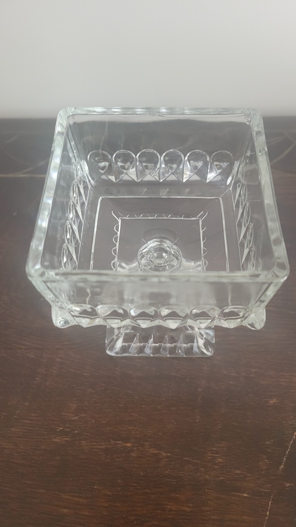 Produced in the 1950s, this pressed glass dish has a unique history rooted in wedding tradition. Originally, they were used to hold a small slice of wedding cake—often a rich fruit cake—which was presented to the bride or guests as a keepsake.