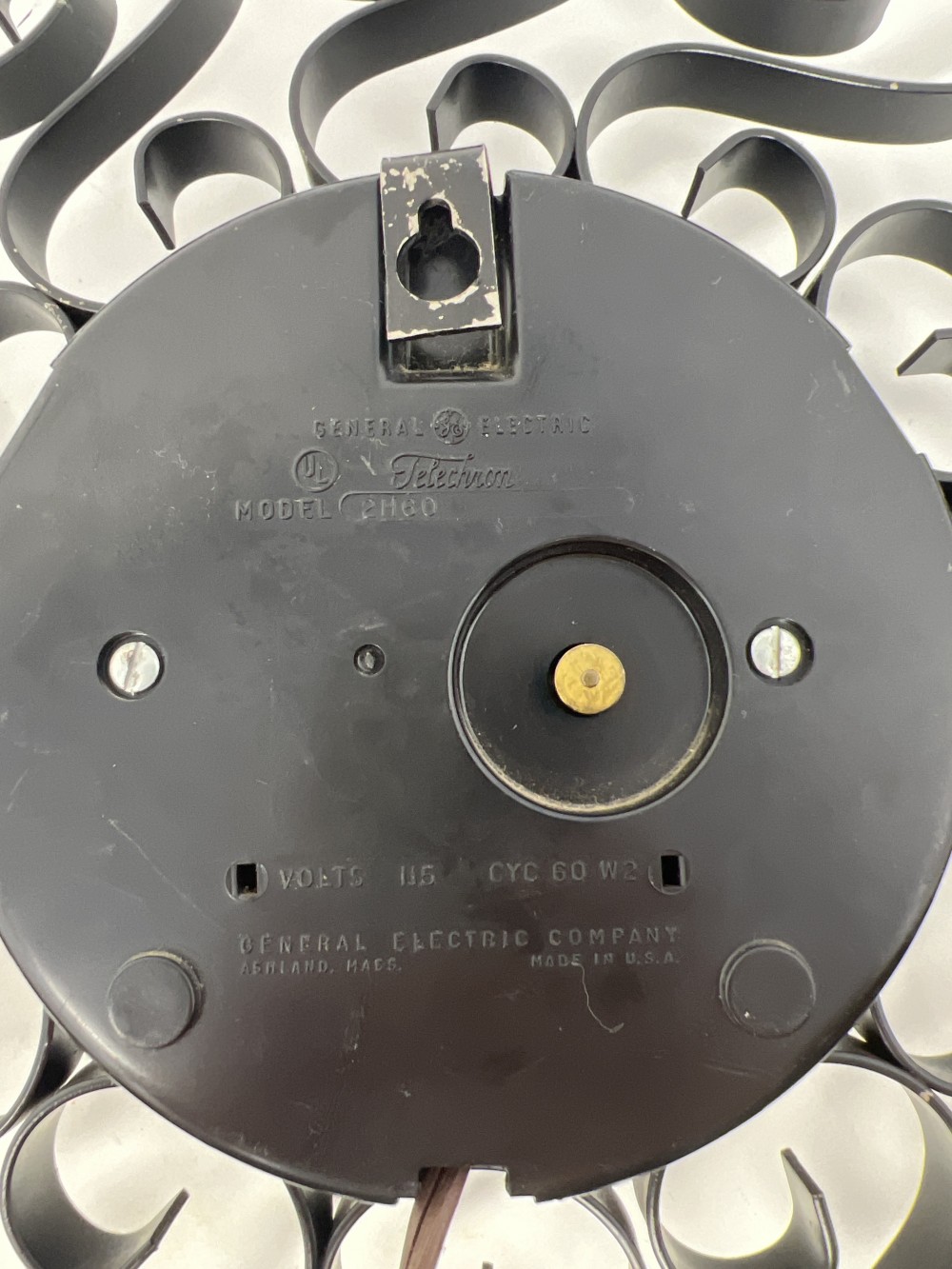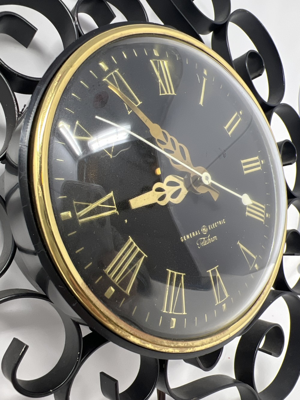 MCM wrought iron wall clock with a dramatic sunburst scroll design and black clock face with gold Roman numerals. Approx. 12” overall diameter with 5” clock face; General Electric Telechron electric clock; working clock; original cord and plug; some black paint loss to metal frame with light age‑appropriate wear.