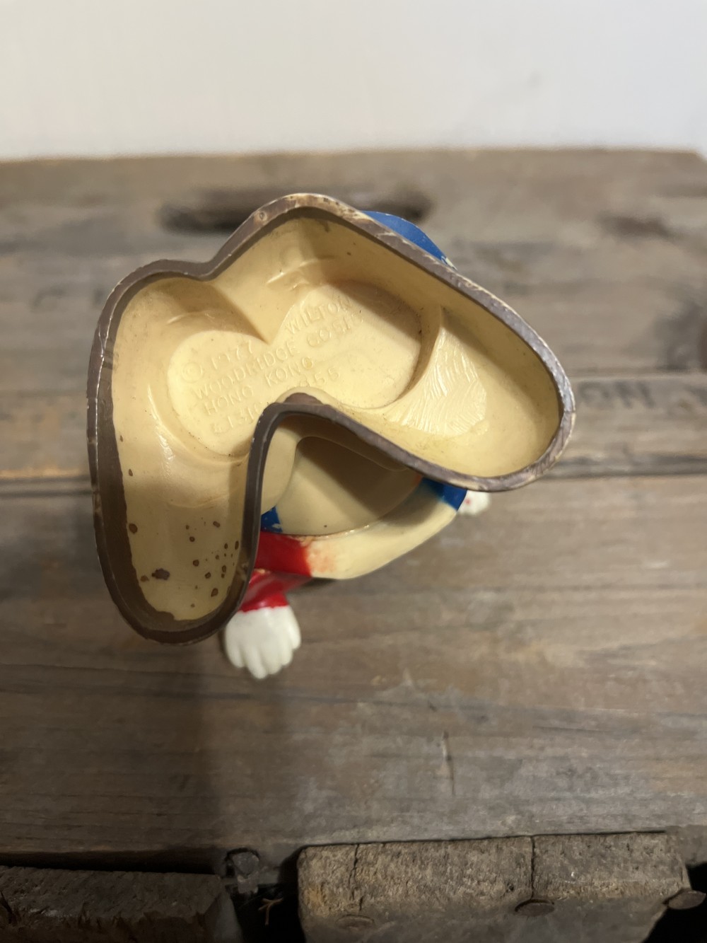 1977 Wilton clown cake topper, made in Hong Kong. This cute little clown is made of plastic, shows signs of love and use, and is missing the juggling ball piece, but it’s still adorable and would make a great addition to any collection. approximately 4 inches tall.