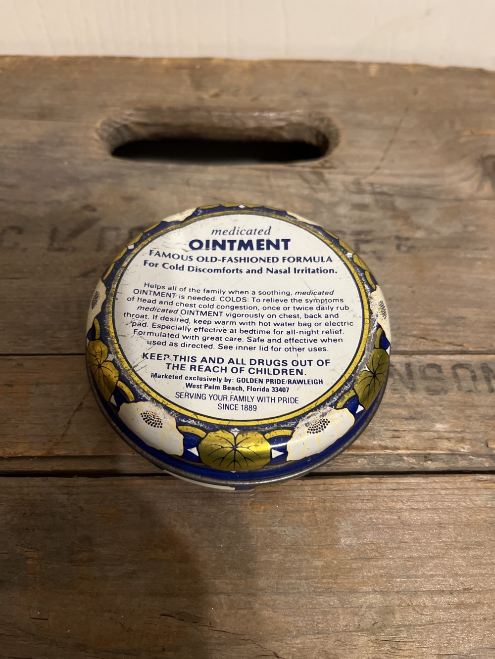 Vintage Rawleigh Medicated Ointment tin, 5 ounce size. This item is preowned in good vintage condition with some signs of wear and a few minor dents. Remnants of original ointment still inside. Lid is snug but comes off easily.