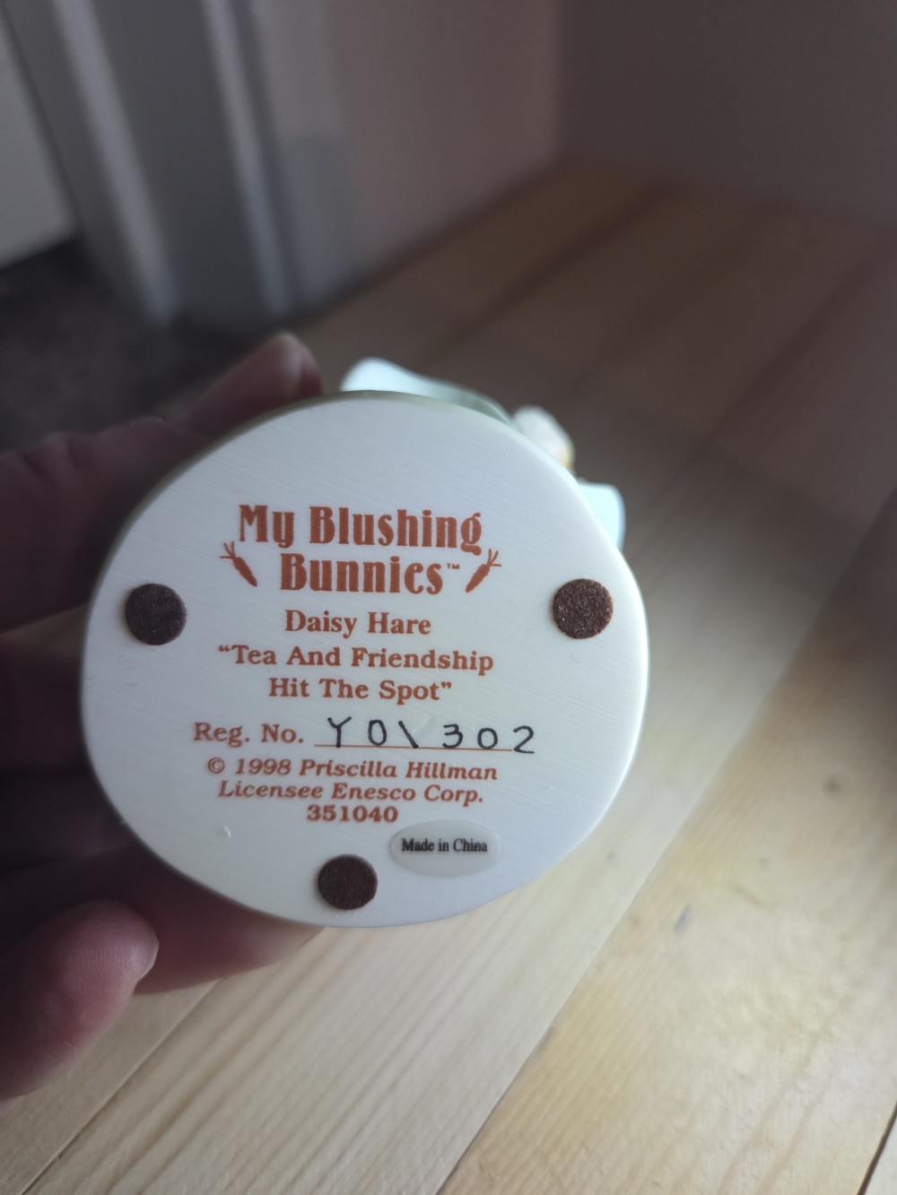 VTG My Blushing Bunnies Daisy Hare Figurine "Tea and Friendship Hit the Spot". 3.5"