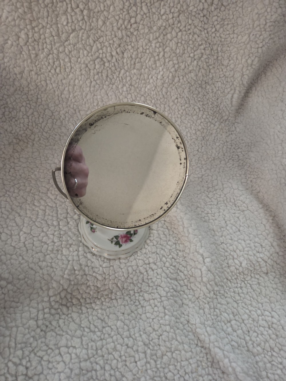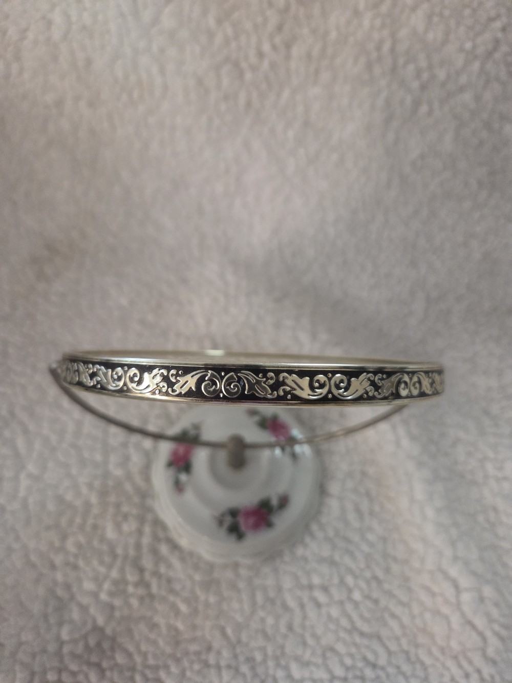 Vintage Porcelain and Metal Vanity Mirror with Decorative Edging. 2-sided. 7 inches.