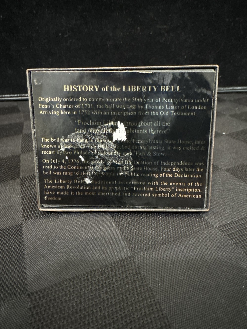 MINATURE REPLICA OF LIBERTY BELL WITH STAND. APPEARS TO BE BRASS, 31/2" BY 4" TALL..