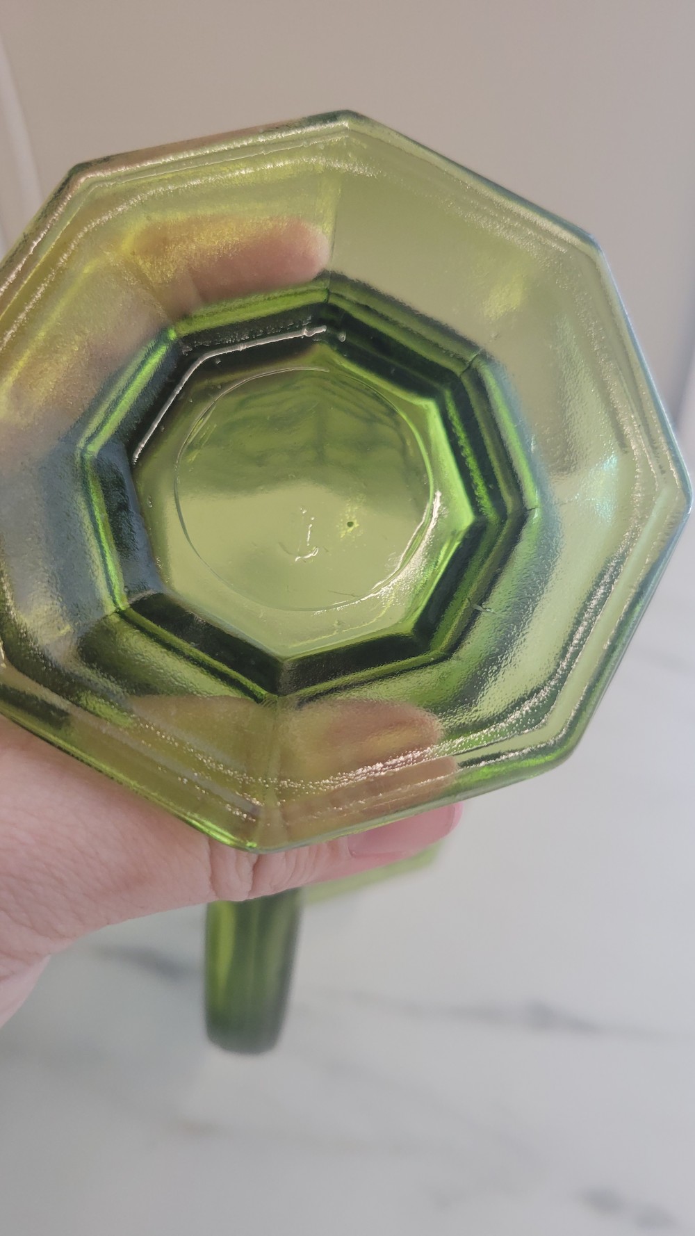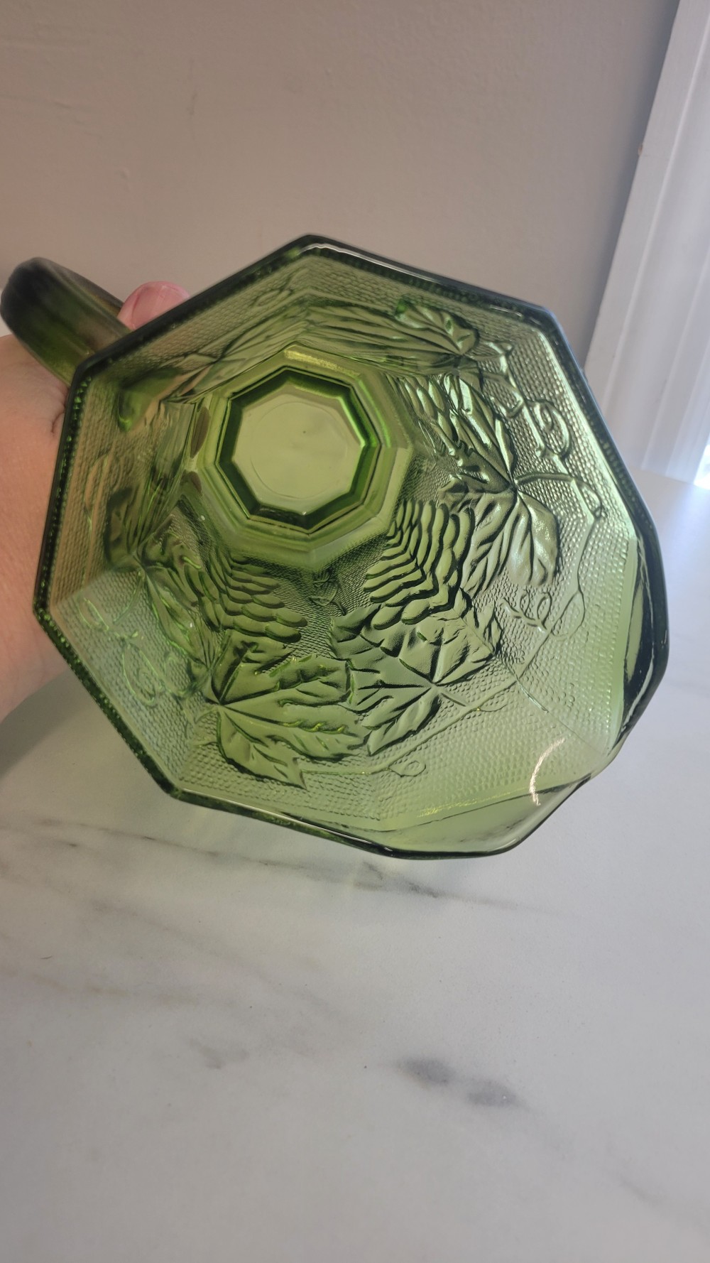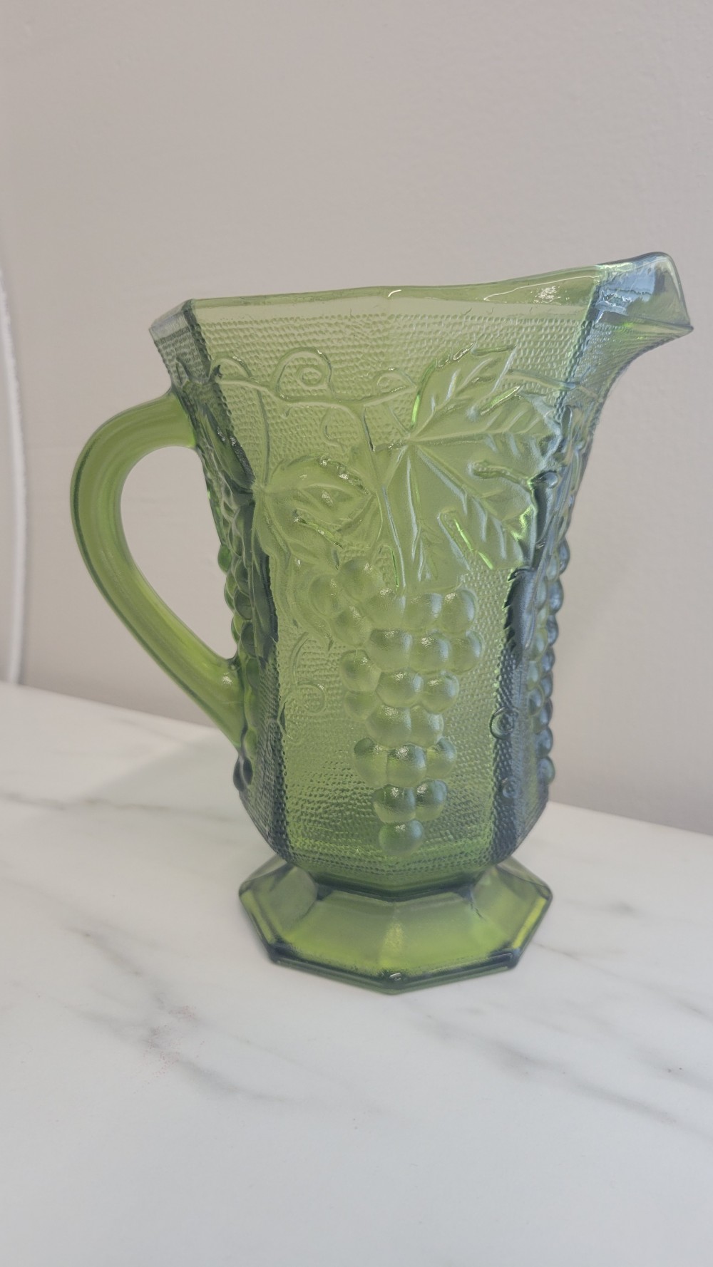This item is a vintage Anchor Hocking "Grape Harvest" pattern glass pitcher in avocado green, featuring an embossed design of grapes and vine leaves.