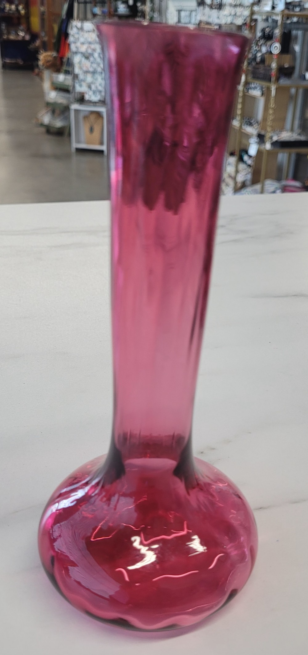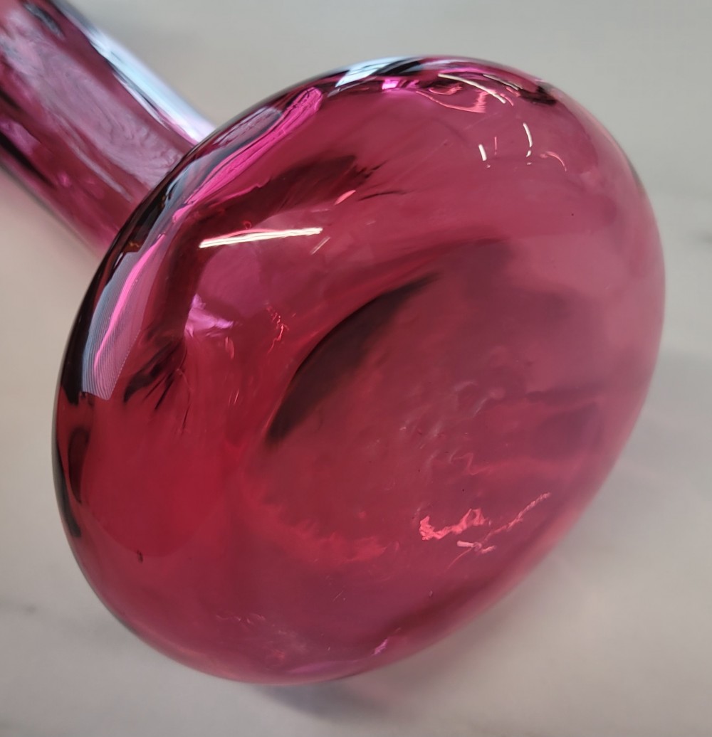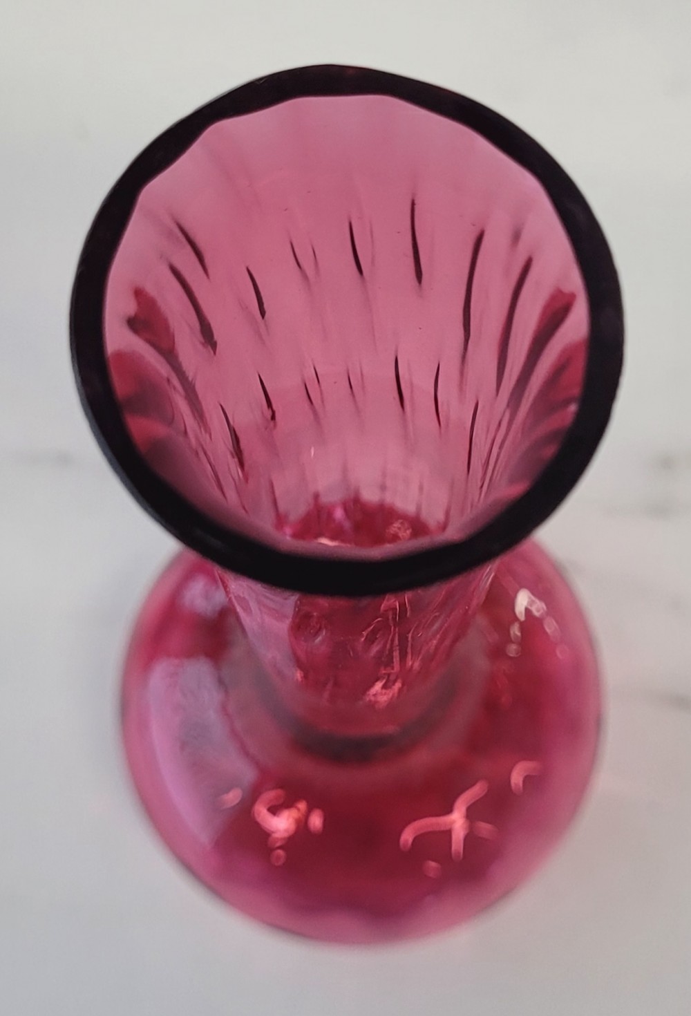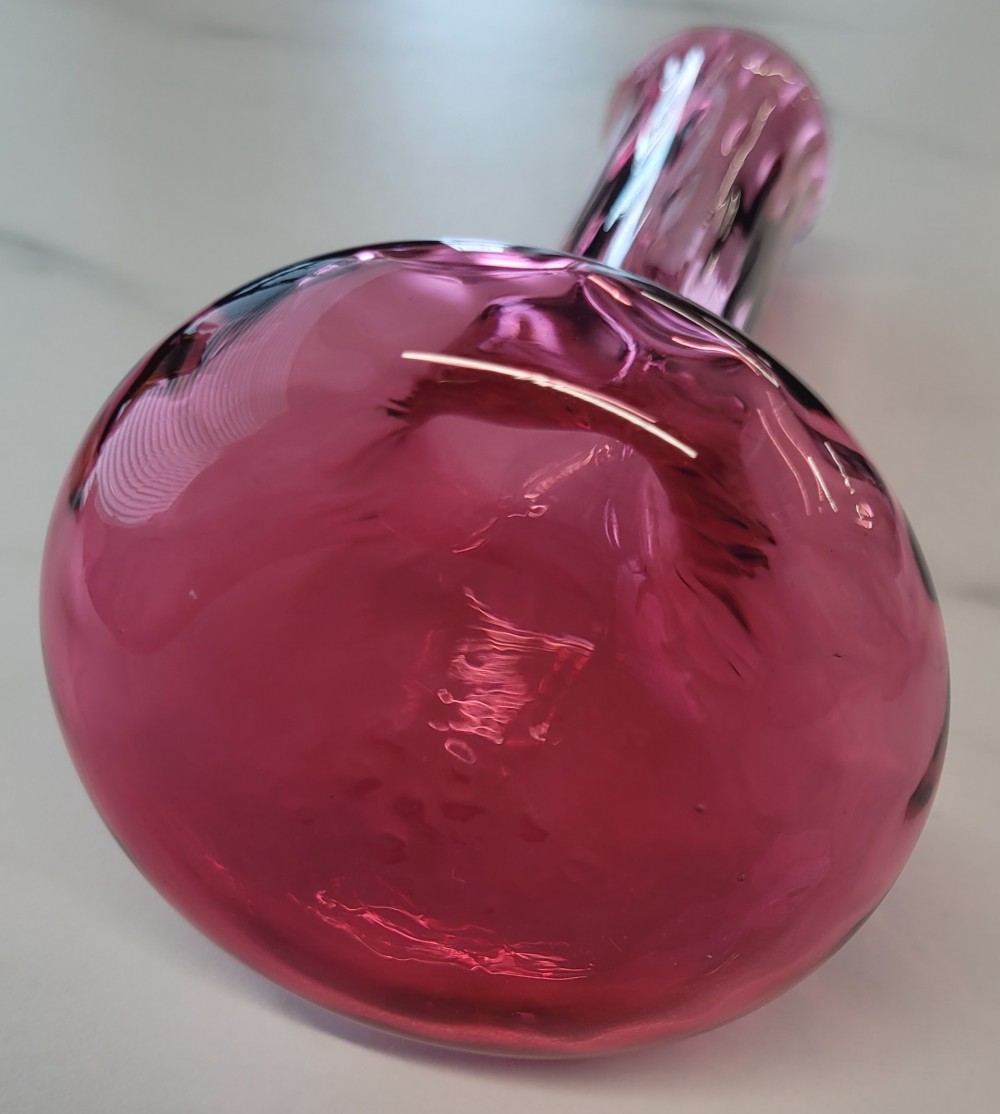 Vintage Pilgrim Glass Corporation cranberry glass bud vase. Approximately 6.75 inches in height and 3 inches at base. Hand blown, excellent condition. No cracks, chips, or damage.