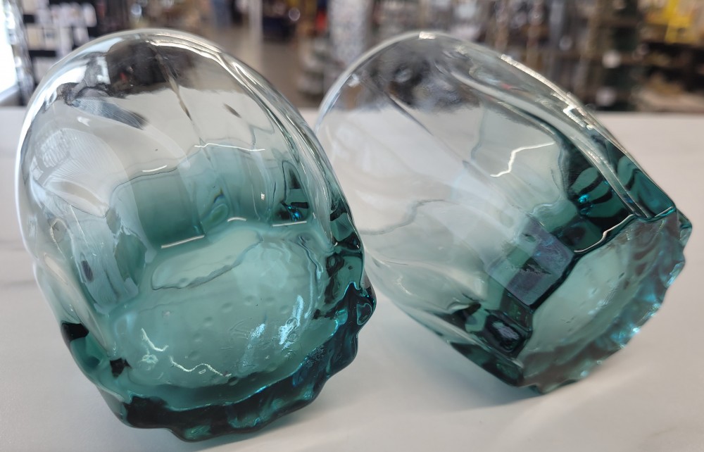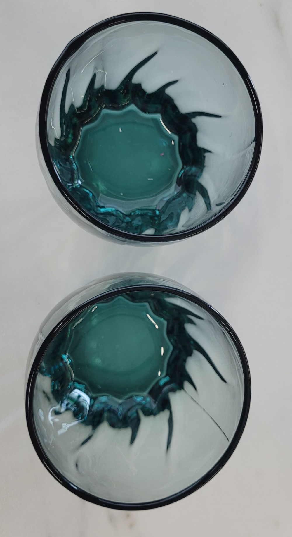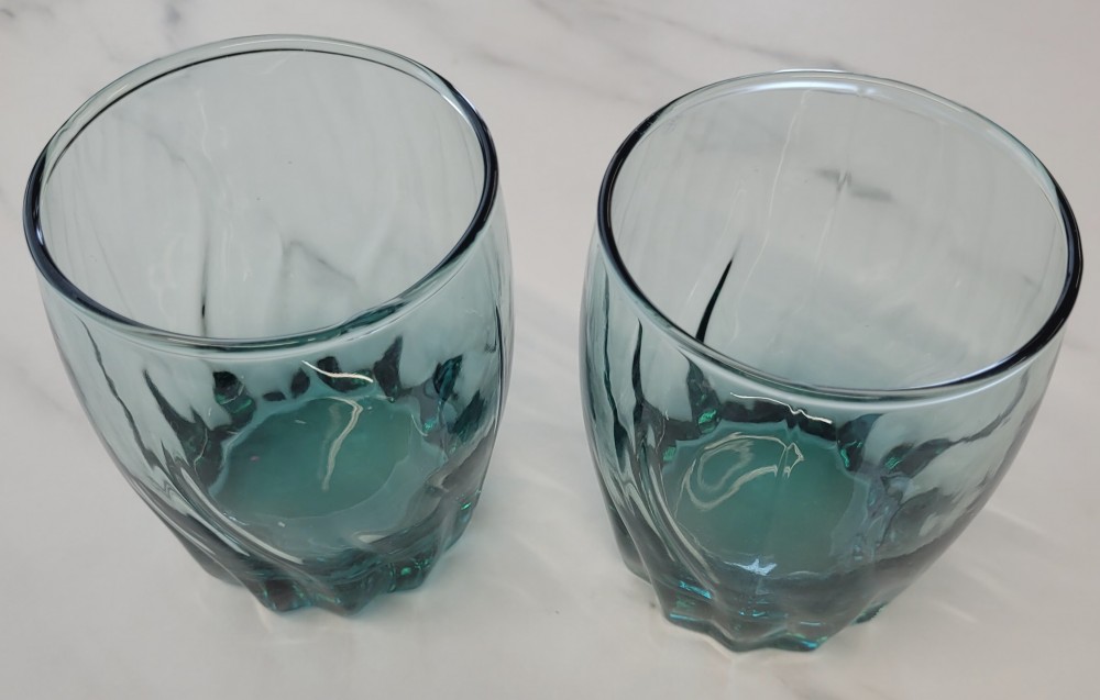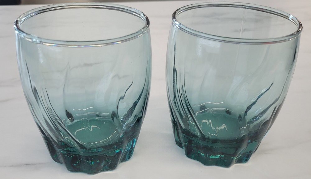 Vintage 1990s AH Central Park Double Rocks glass pair in aquamarine. Excellent vintage condition, no chips, cracks, or damage. 12 oz capacity, approximately 4 inches tall.