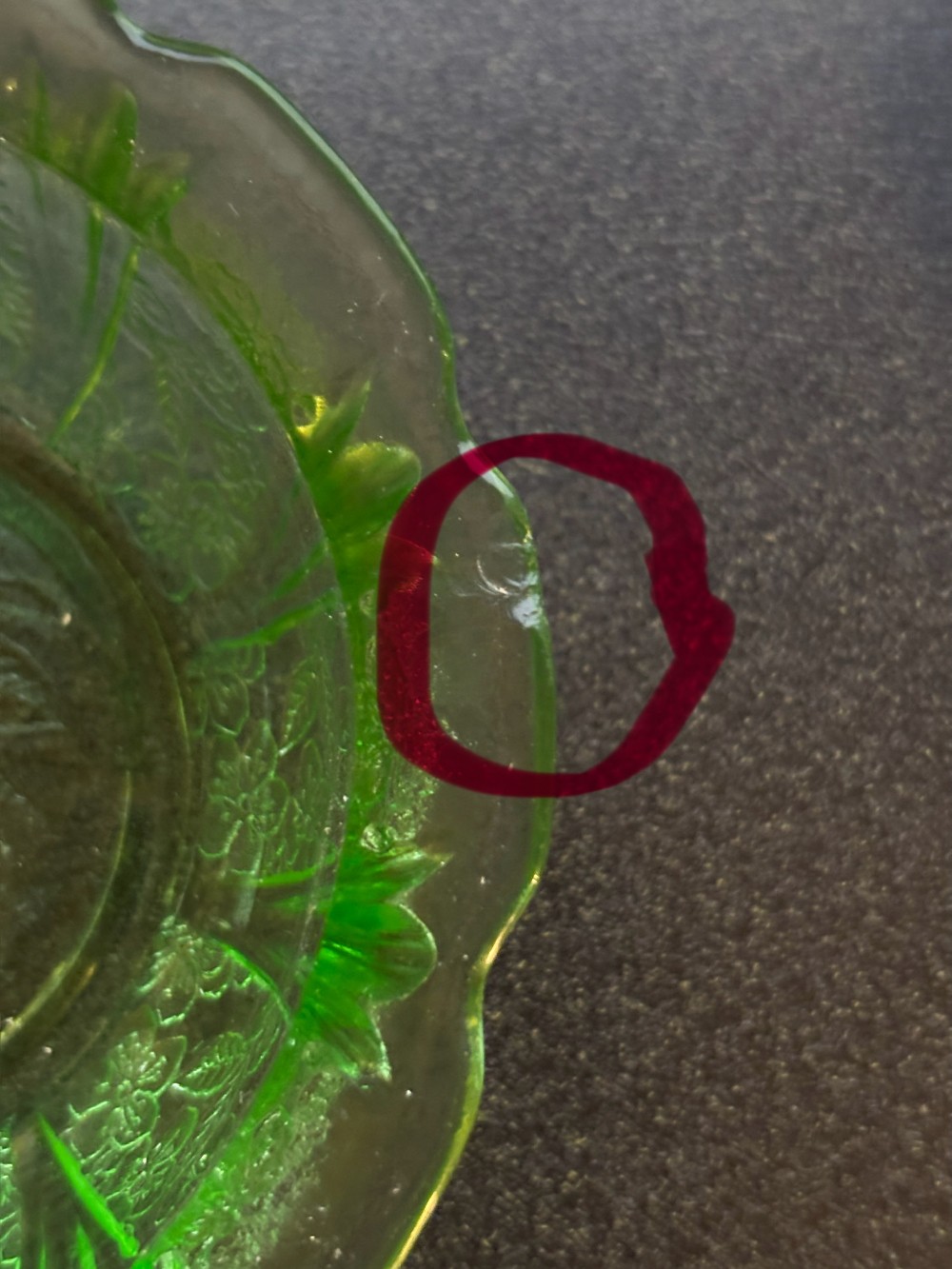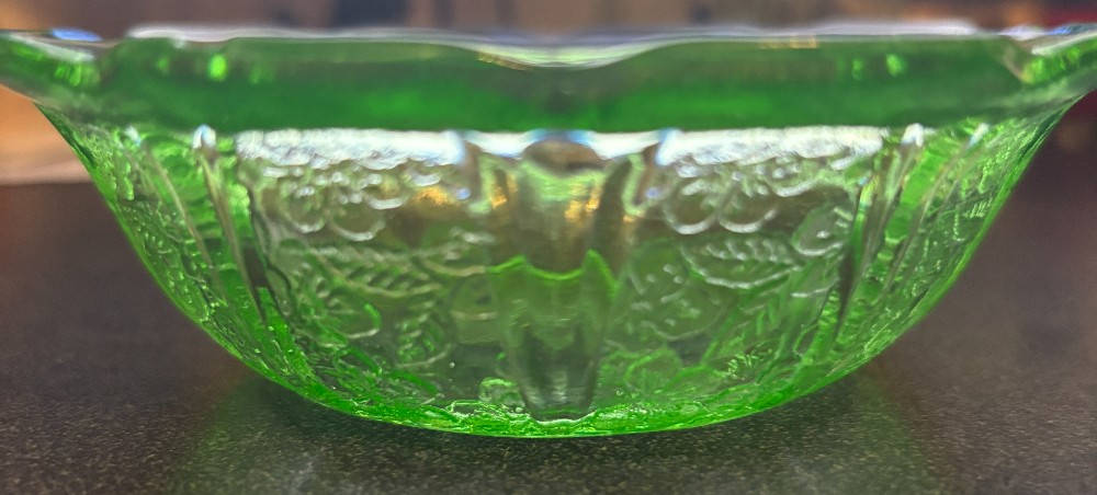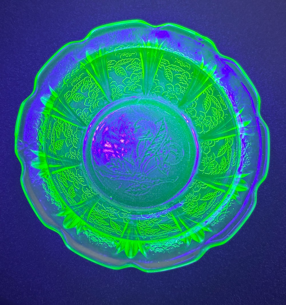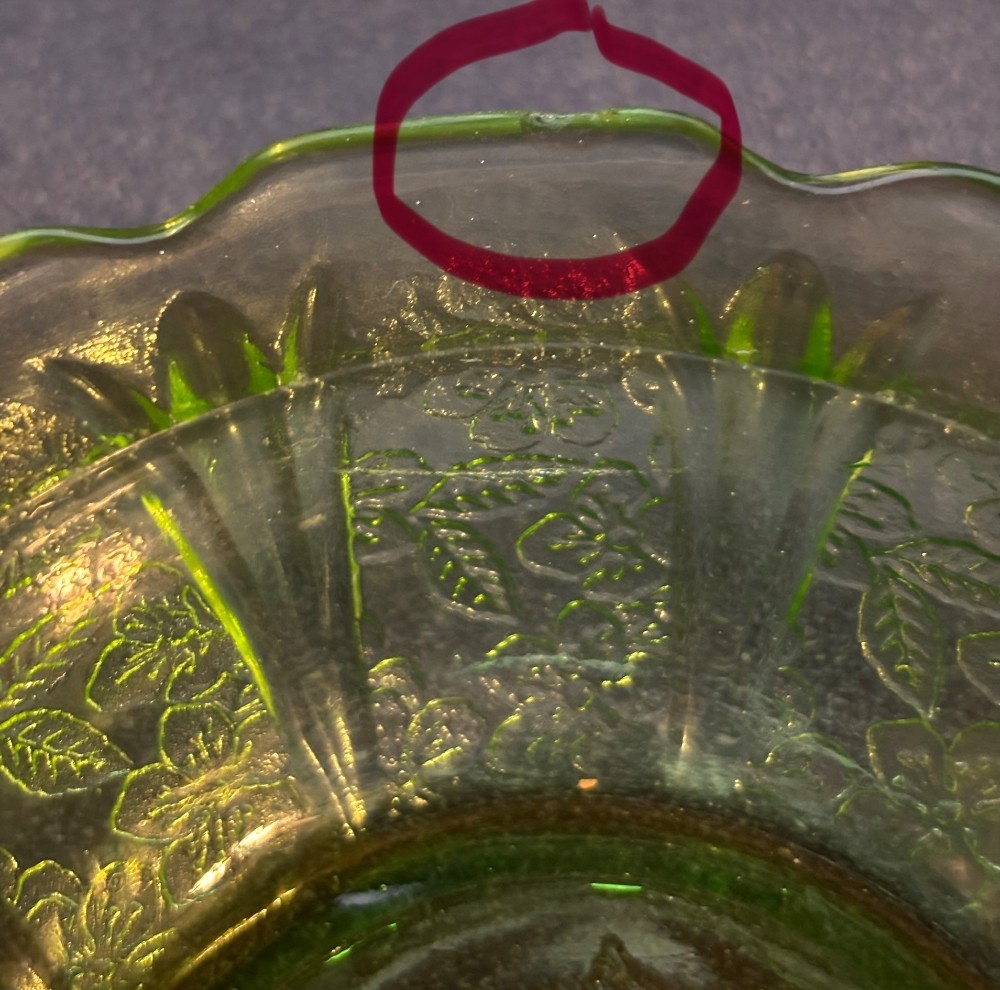 AS IS Dessert bowl uranium geen Depression Glass Cherry Blossom. Two chips on rim SEE photos.