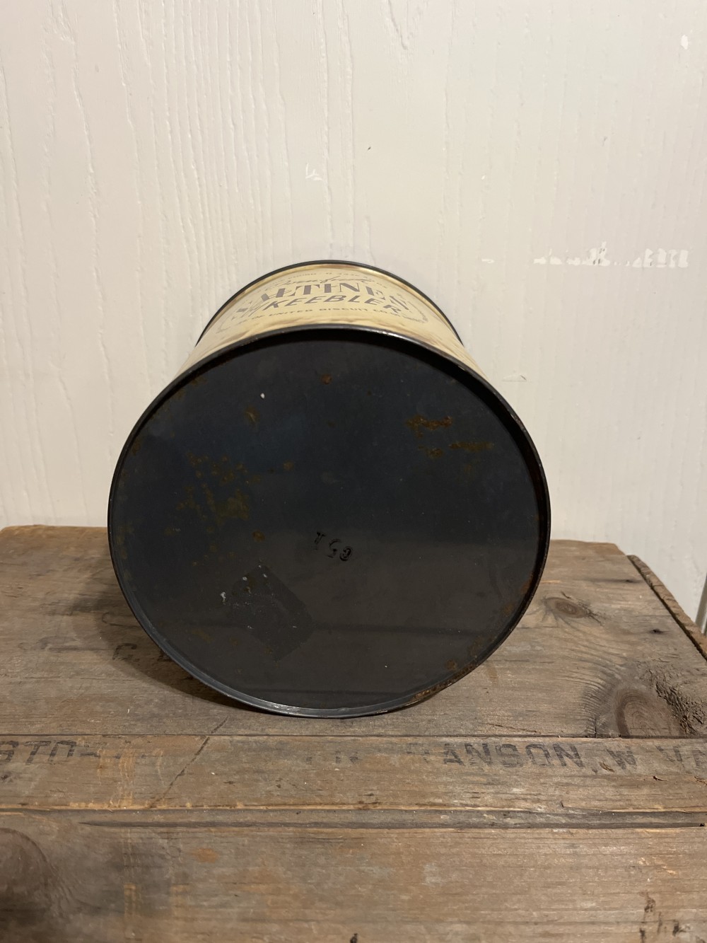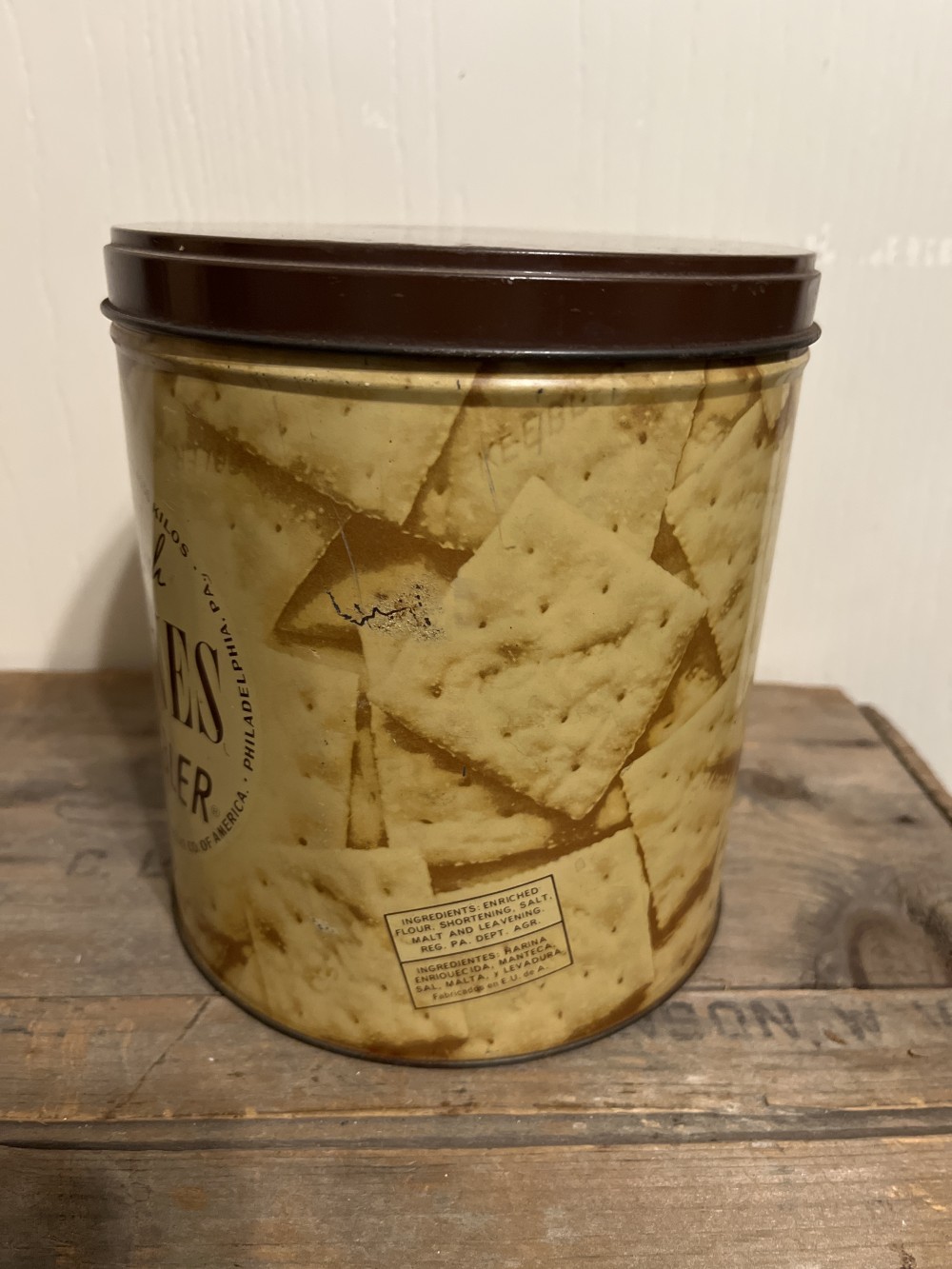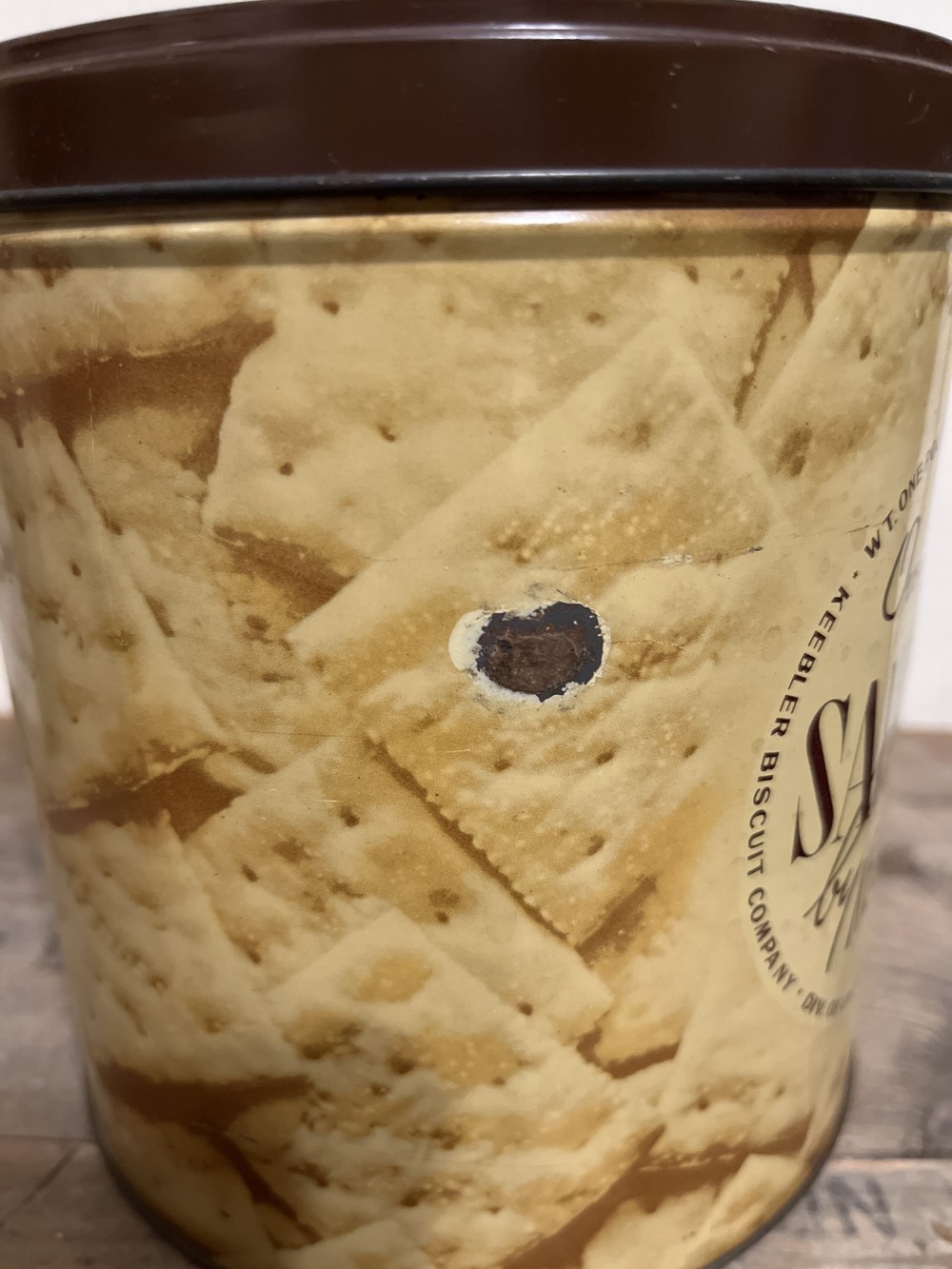 Vintage Oven Fresh Saltines by Keebler tin. This item is preowned in good vintage condition with one rust spot. Lid is on tight. Measures 6.5” tall x 6” in diameter.