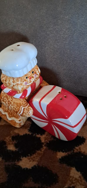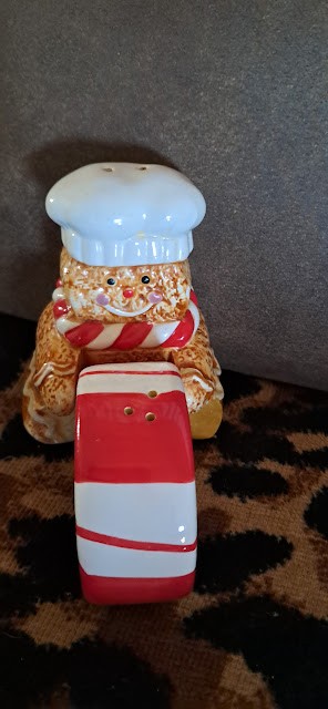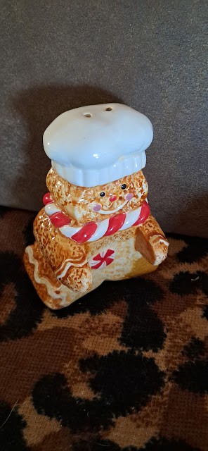 Vintage Gingerbread Cookie Jar and Ginger Mint Salt/Pepper Shaker set. The cookie jar is in excellent condition, the gingerbread salt shaker does have a shaved off piece on foot which had been painted gold color with a paint marker, but still a great set.