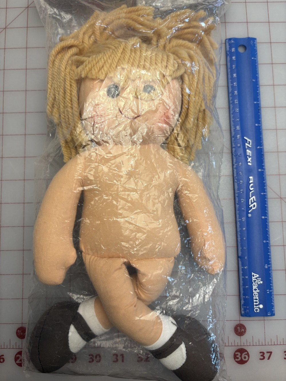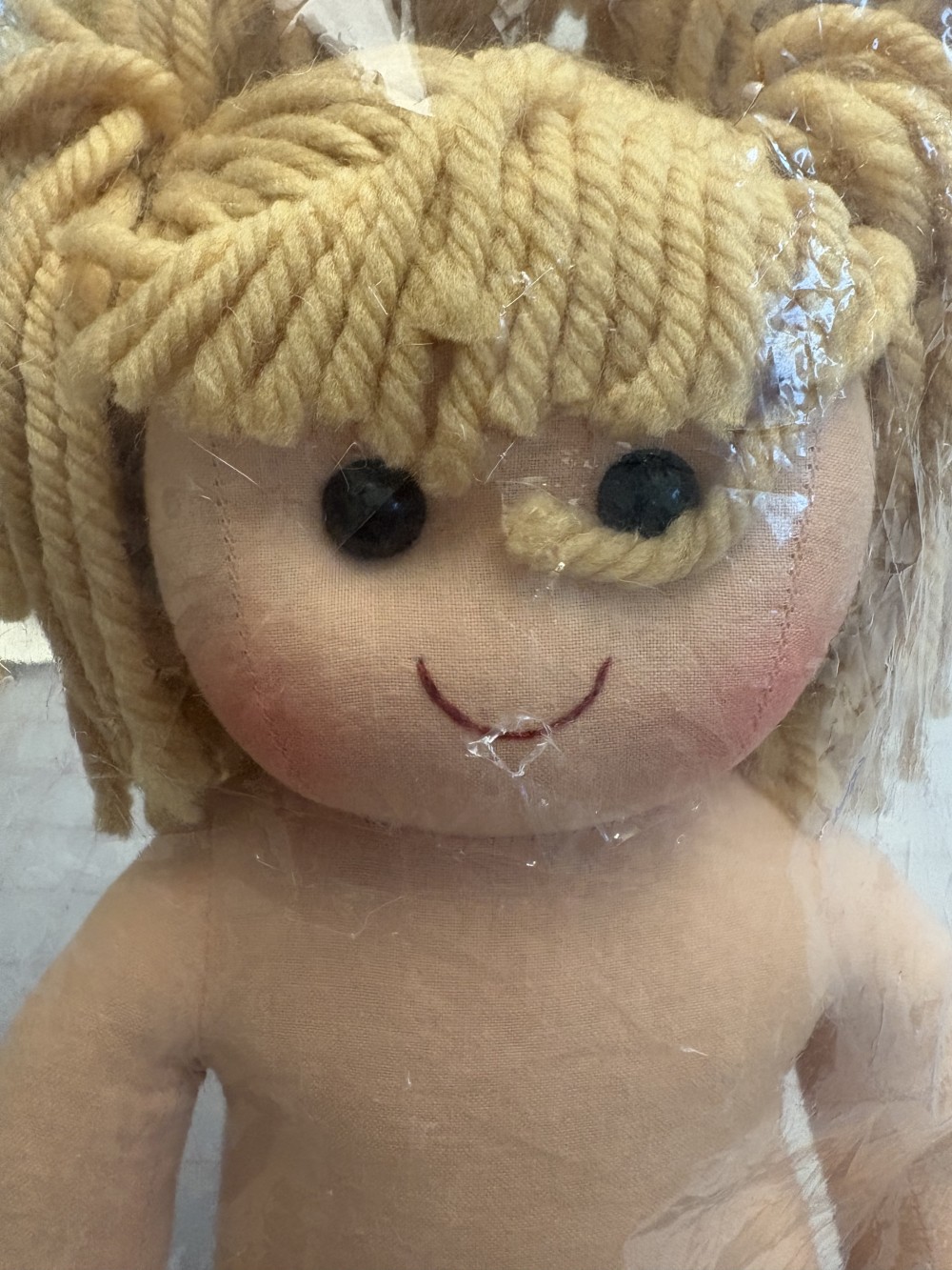 Doll is 13 3/4" tall.New in packagingBlonde yarn hairSoft texture.
