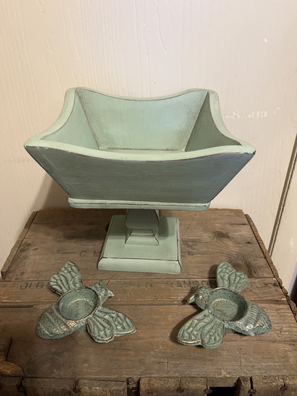 Vintage square wood pedestal bowl/planter that has been upcycled with mint green paint and antiquing wax finish. Measures approximately 8“ tall x 8” wide.