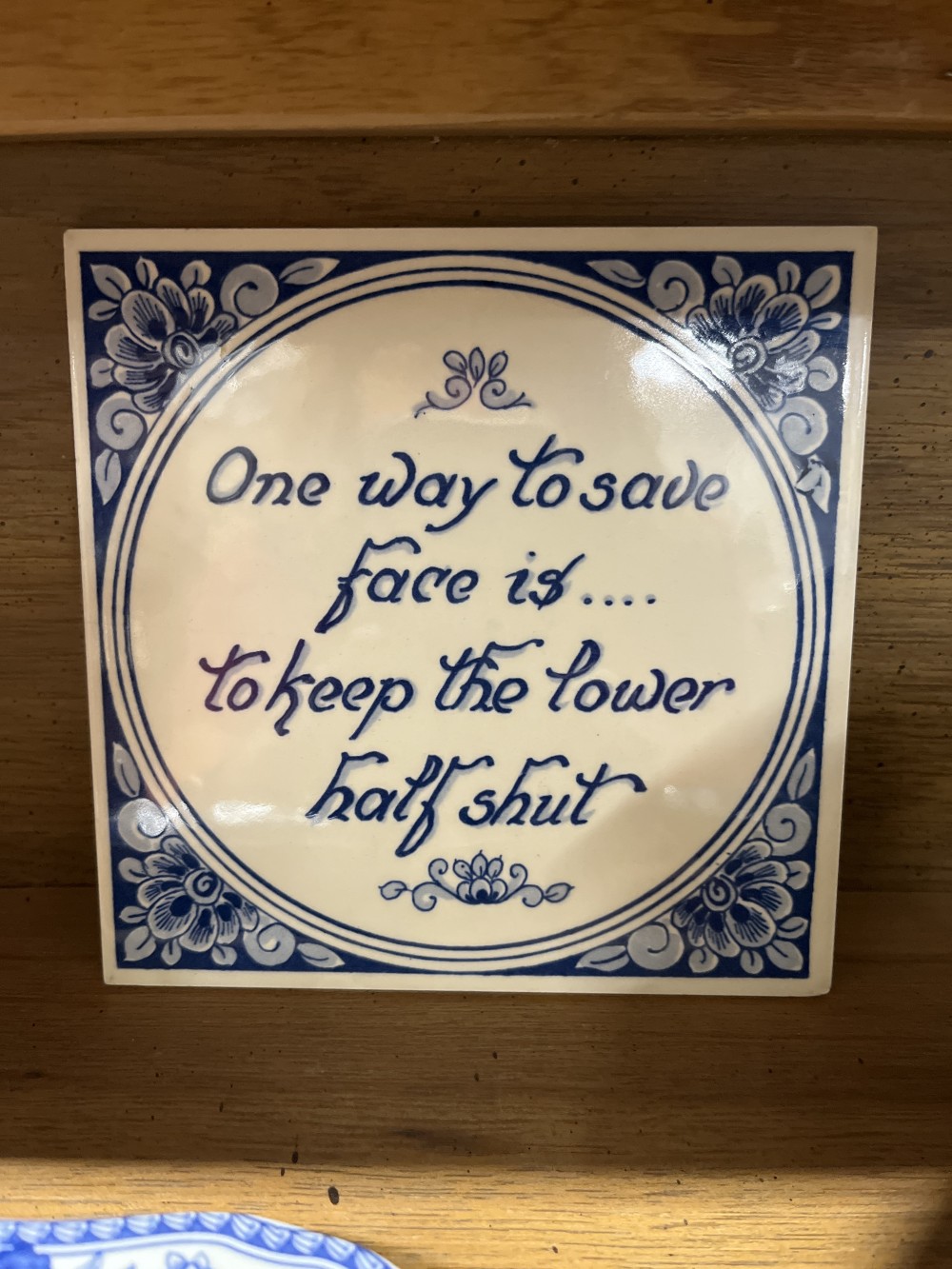 Vintage hand painted Delft tile with humorous Dutch saying - 2 available. 6” x 6”