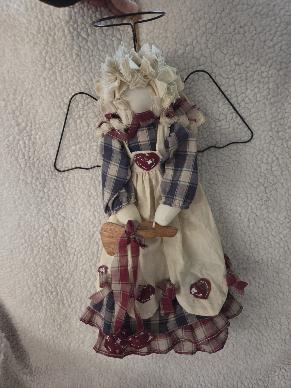 Vintage country ragdoll angel wall hanging with metal wings and halo. 19 inches.
