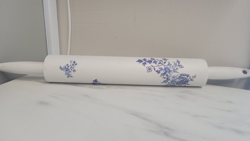This is a wooden rolling pun that has been painted with Fusion paint in Casement. Blue floral transfers have also been added.
